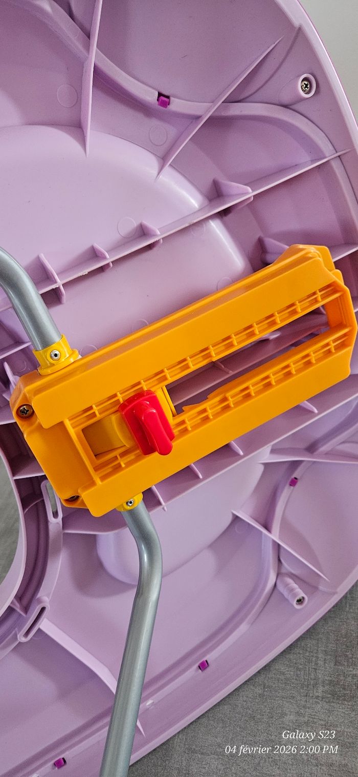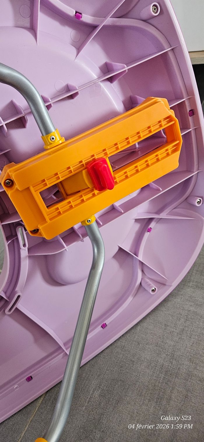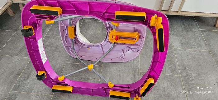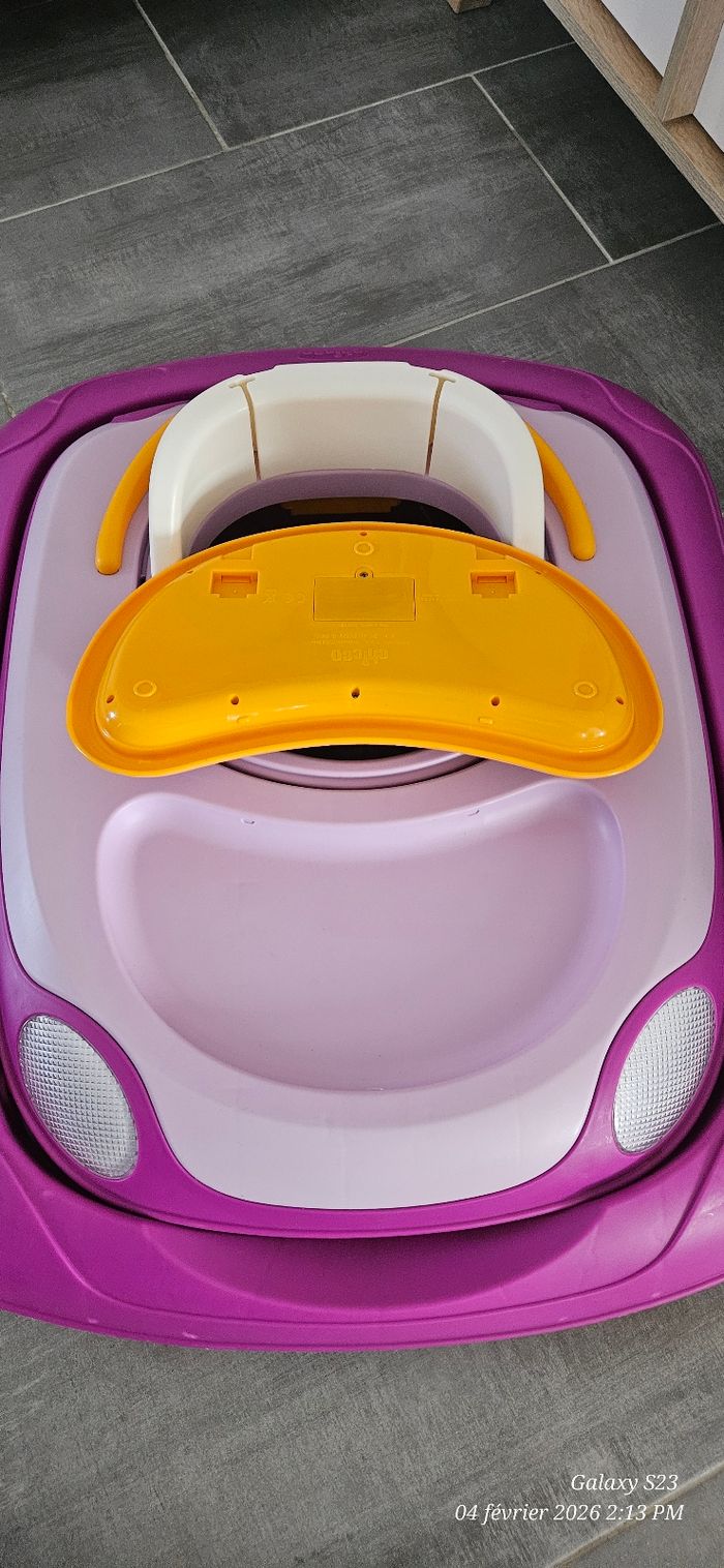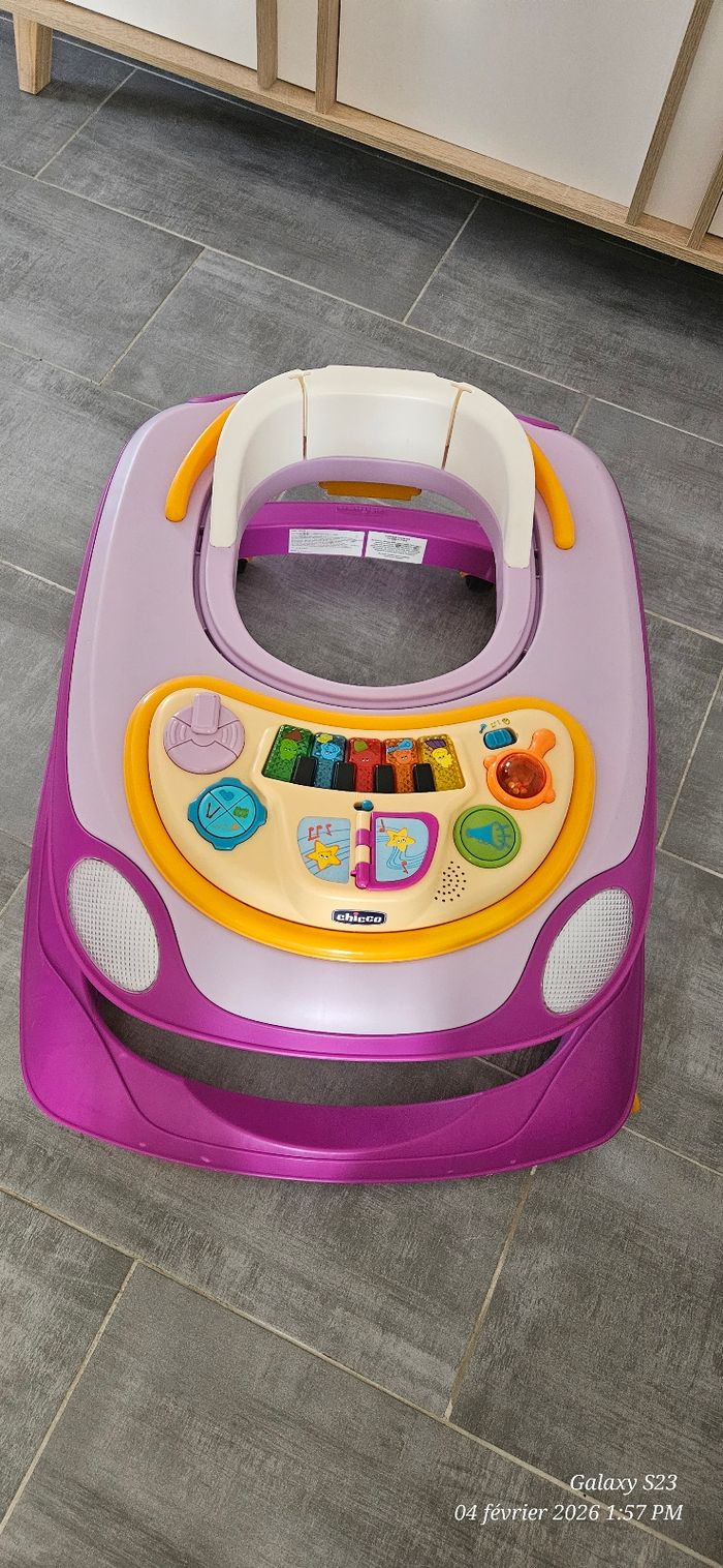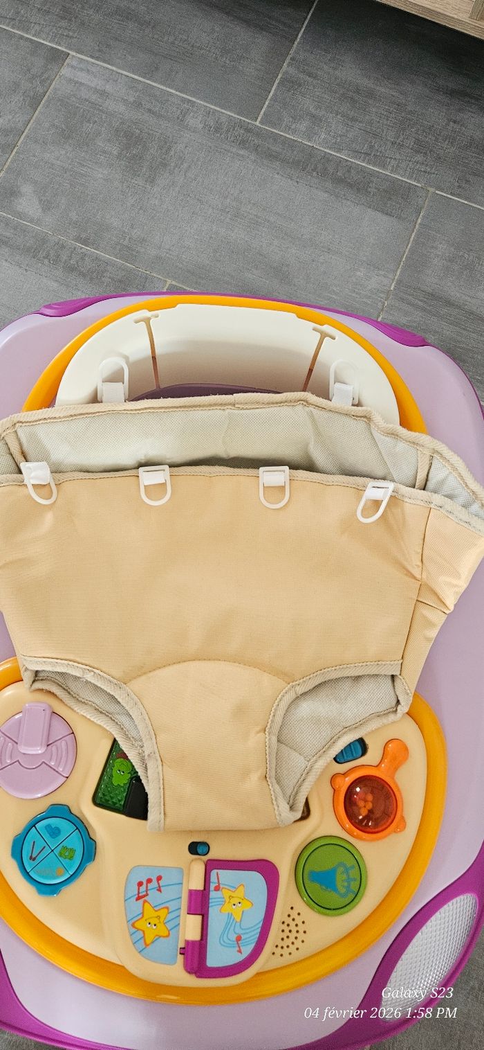 Trotteur réglable en hauteur sur plusieurs niveaux. Pliable pour gain de place. Tablette d'activité musicale. Assise amovible, imperméable et lavable. Première main, état proche du neuf.