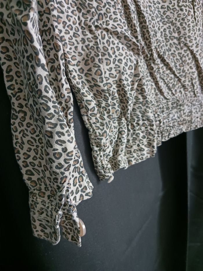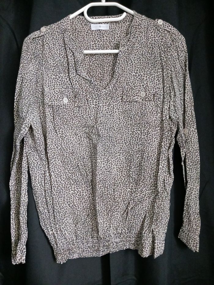 Blouse "Cache cache" à petits motifs léopard marron et ecrue mnches longues, avec 2 poches poitrine boutonnées et 2 epaulettes boutonnées,smokes en bas (il n'est plus élastique sur environ 10cm). Manches fermées par bouton. Taille 1
