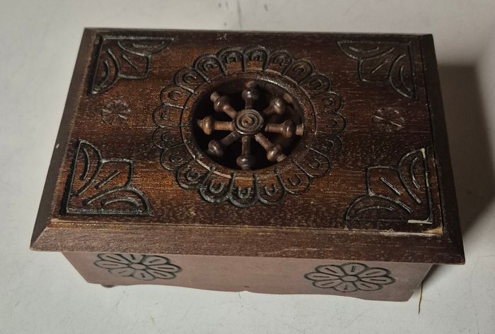 boîte en bois artisanale ancienne, dimensions 15 × 10 × 7 cm ornée de sculptures florales et géométriques sur le couvercle et les faces. décor central en forme de roue ou rosace, entouré de motifs végétaux finement travaillés. pieds arrondis, charnières métalliques, finition rustique. idéale pour ranger bijoux, petits objets ou comme élément décoratif Très bon etat #boîtesculptée #boisartisanal #boîteàbijoux #boîteethnique #boîtevintage #boisfloral #décorationbohème #boisancien #boîteàtrésors #boîteenbois #boiteancienne #boitevintage