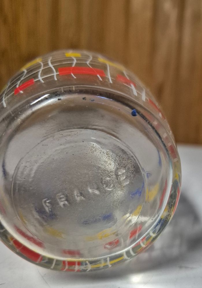carafe en verre vintage, hauteur 23 cm, diamètre 10 cm. décor géométrique coloré (rouge, jaune, bleu) sur fond transparent, style pop art rétro. bouchon doré avec poignée ondulée, base en liège. estampillée “france” sous le verre. pièce décorative idéale pour bar rétro, cuisine vintage ou collection de verrerie française. peut servir de flacon, carafe ou objet de vitrine. Tres bon état #carafevintage #verrevintage #verrecoloré #madeinfrance #verrerieancienne #carafepopart #décorationrétro #flaconvintage #verreàmotifs #bouchondoré