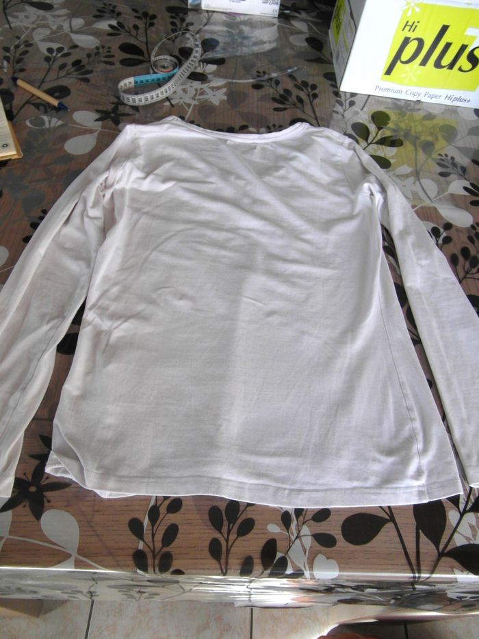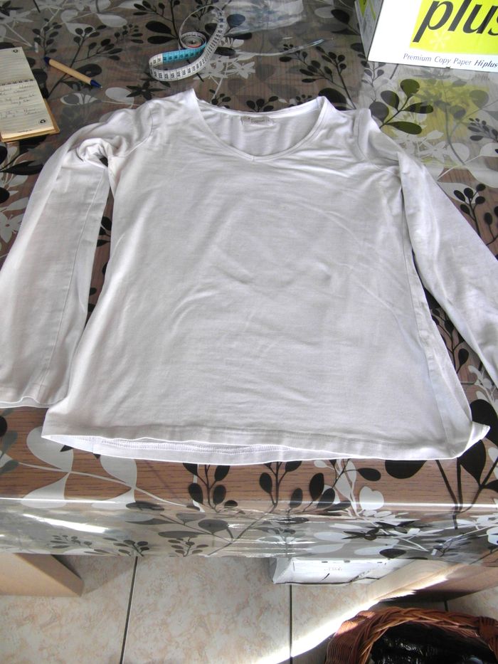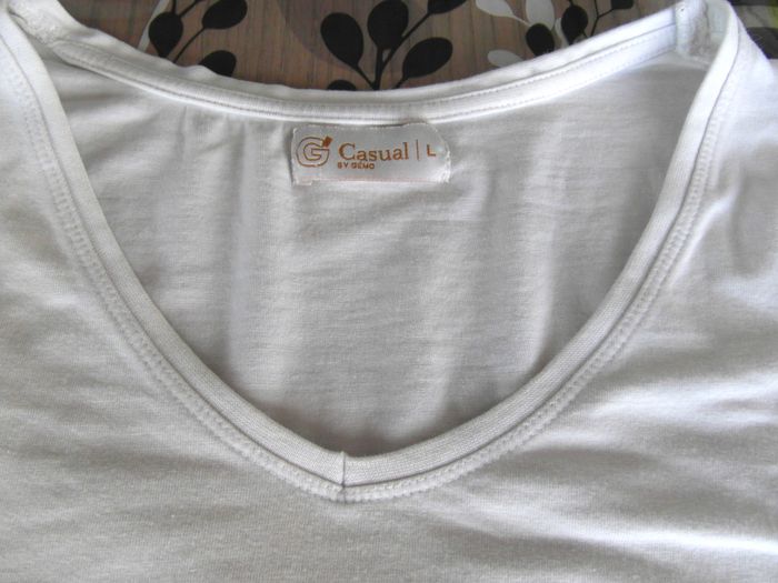 blanc col V taille L GEMO bon état épaules 35 cm ; aisselles 43 cm; longueur 60 cm