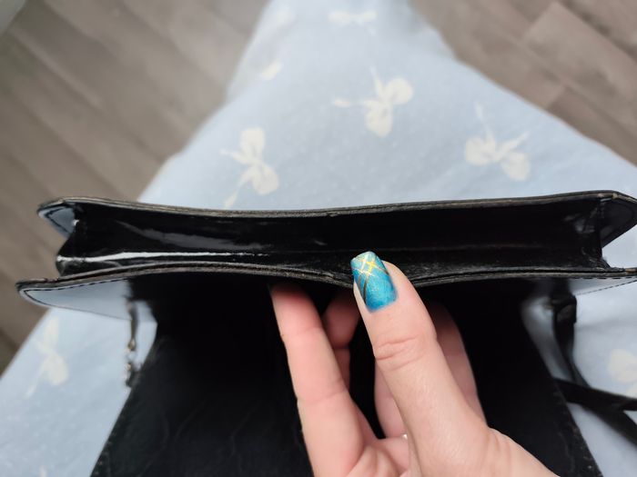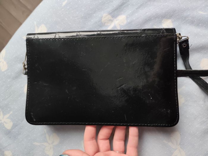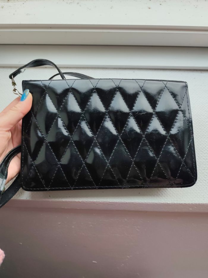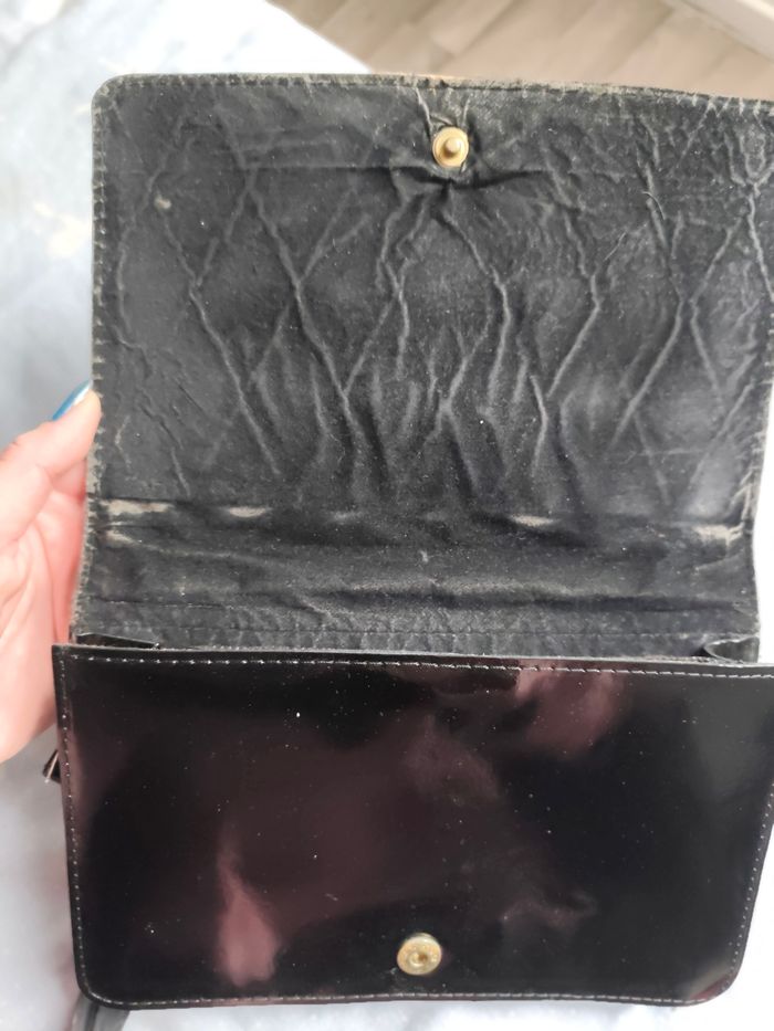 Pochette matelassé sur le devant En simili cuir vernis noir Intérieur un peu fripé, voir la photo