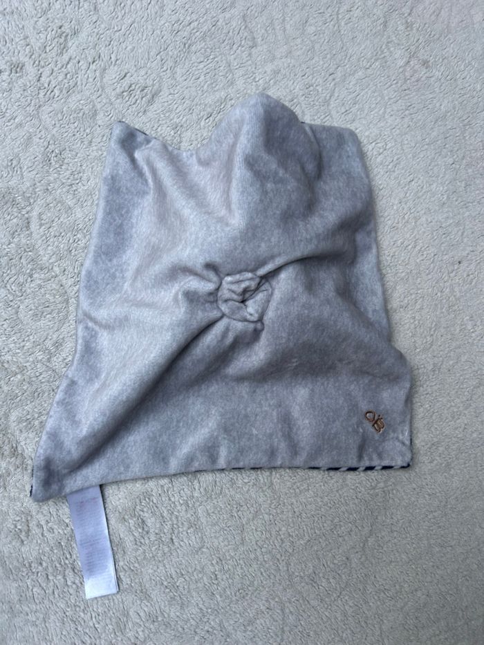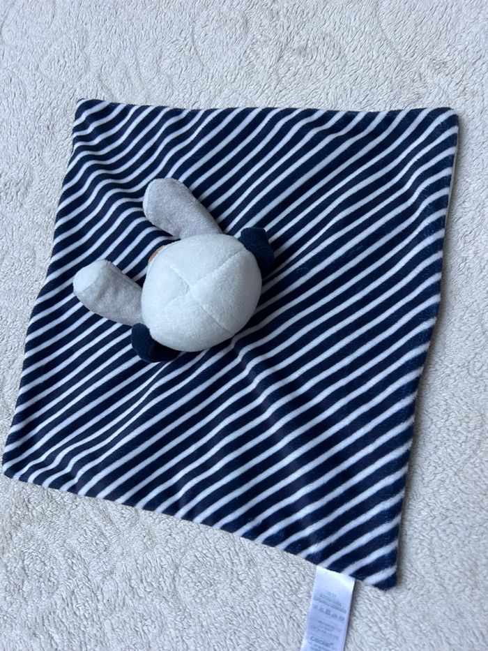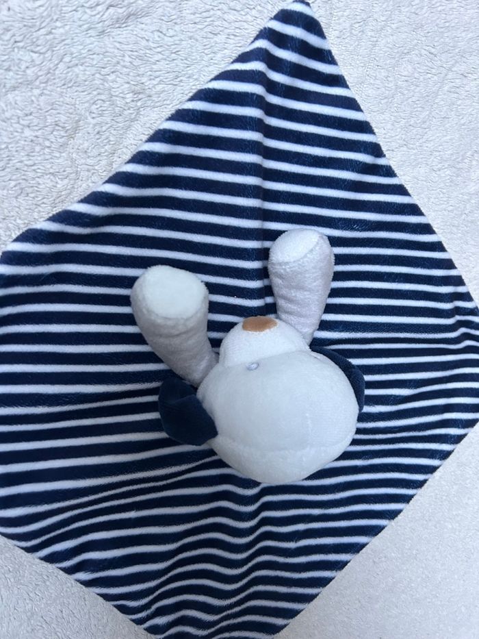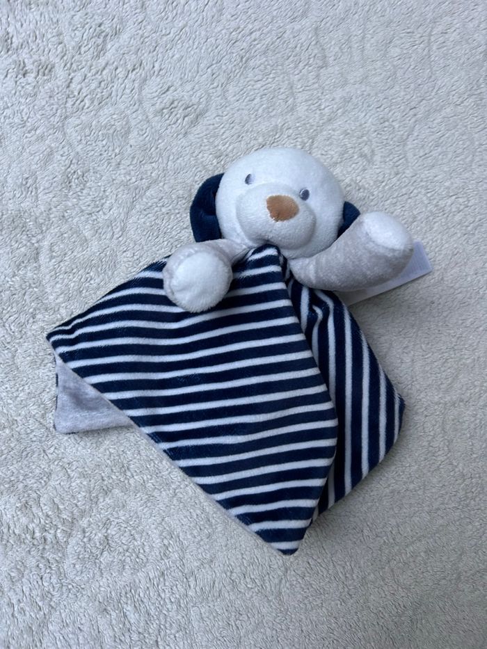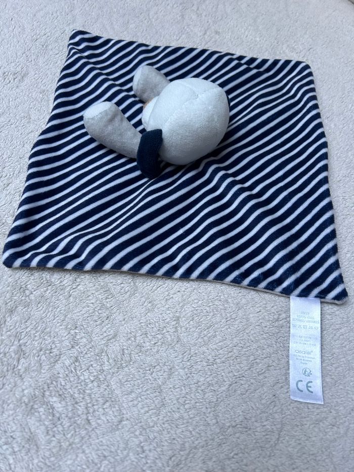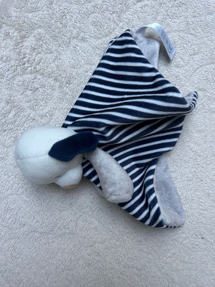Doudou plat CHIEN en parfait état marque OBAIBI velours tout doux gris et rayé bleu marine et blanc