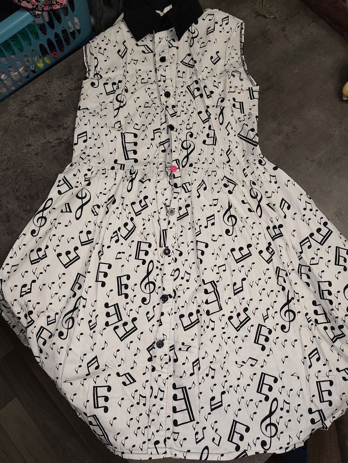 Pour un look original cette superbe robe arboré de notes de musique sera parfaite pour des sorties ensoleillées et musicales Avec un col noir pour un côté chic