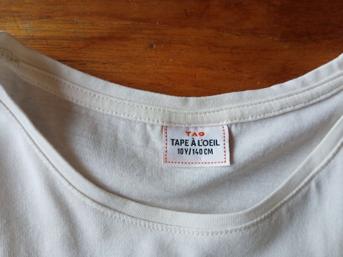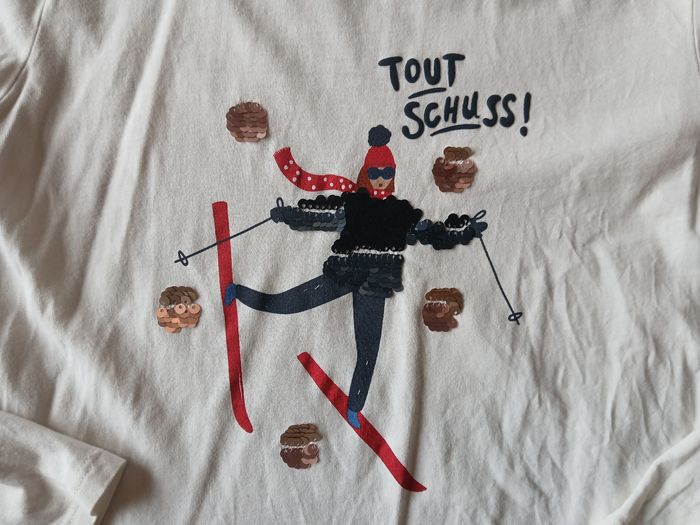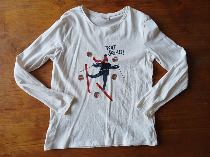 T-shirt à manches longues blanc avec dessin d'une femme a ski (certains petits details en sequins), marqué "Tout schuss" Marque Tape a l'Oeil Taille 10 ans / 140 cm Très bon état