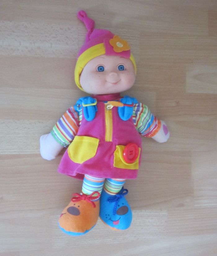 Poupée éducative pour apprendre a : lacer, manipuler les boutons, ouvrir et fermer fermeture éclair. Corps mou.