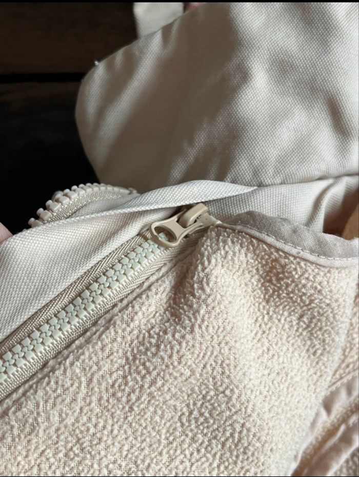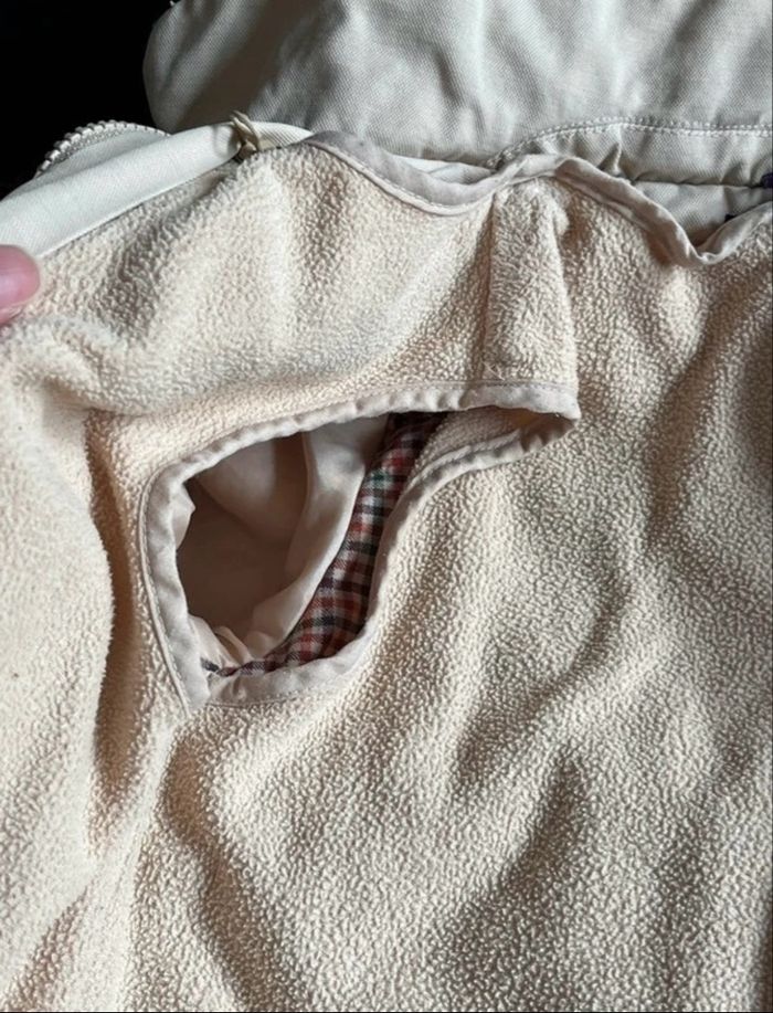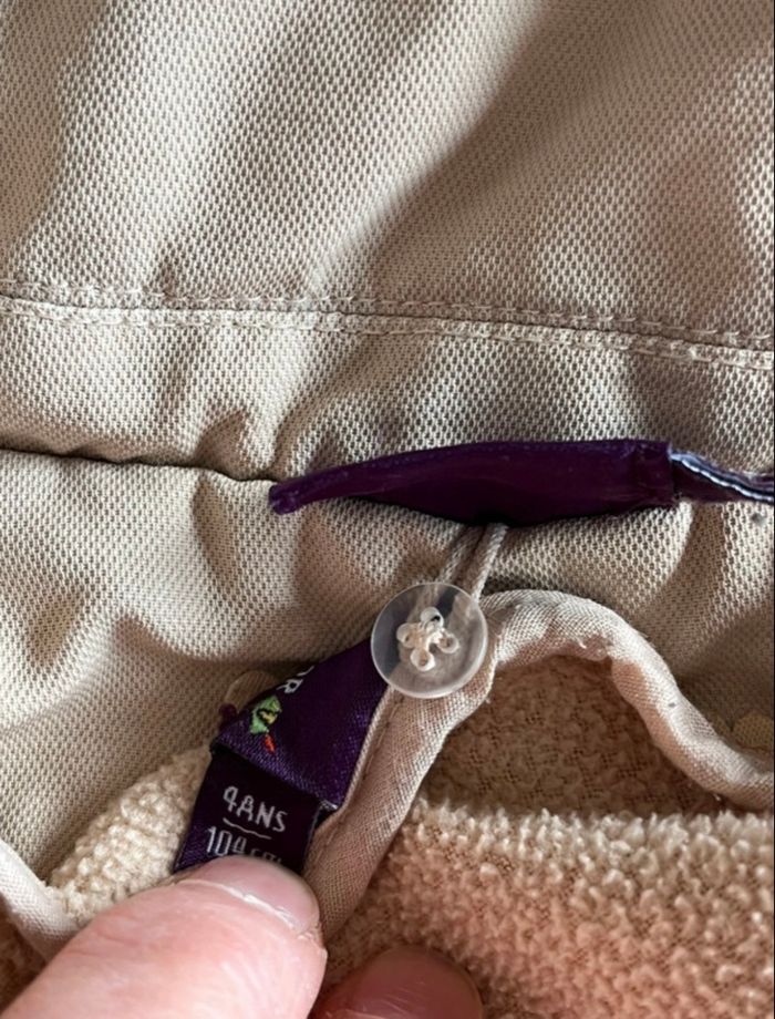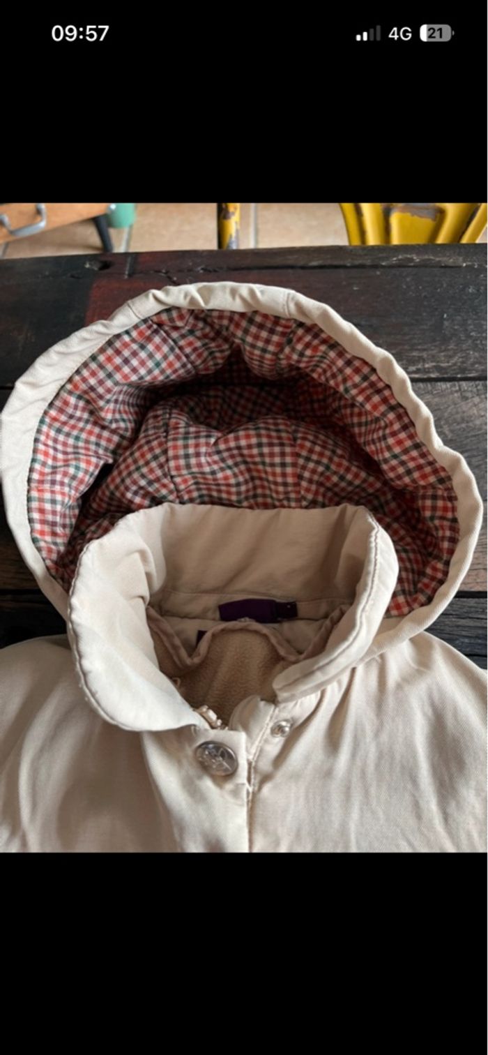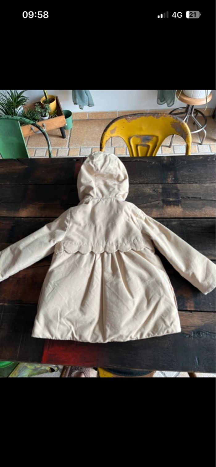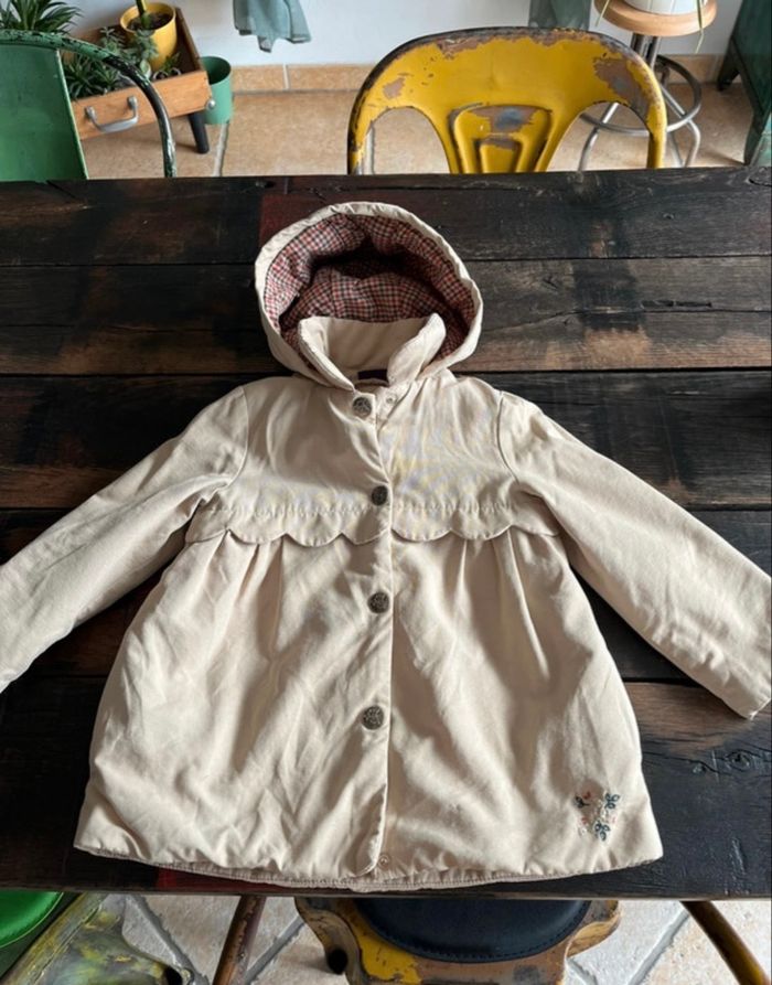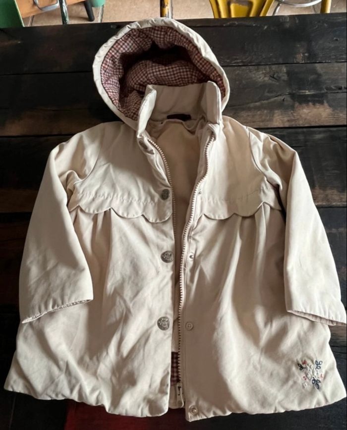 manteau fillette avec doublure intérieure amovible par zip , fermeture par zip et boutons pressions sur le devant, capuche non amovible, bon état général , couleur café au lait, a été porté mais reste propre