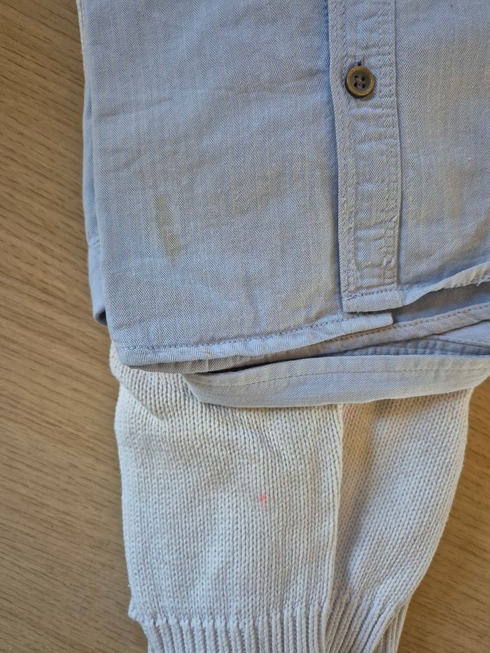 1 jean 3 chemises ML 1 pull 1 Haut de pyjama 3 tee-shirts En bon état général et très bon état Une légère tâche en bas sur une chemise bleue Et une marque de feutre sur manche pull