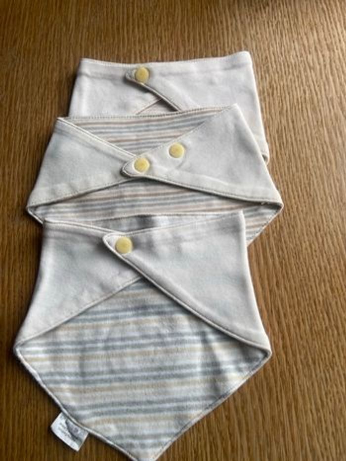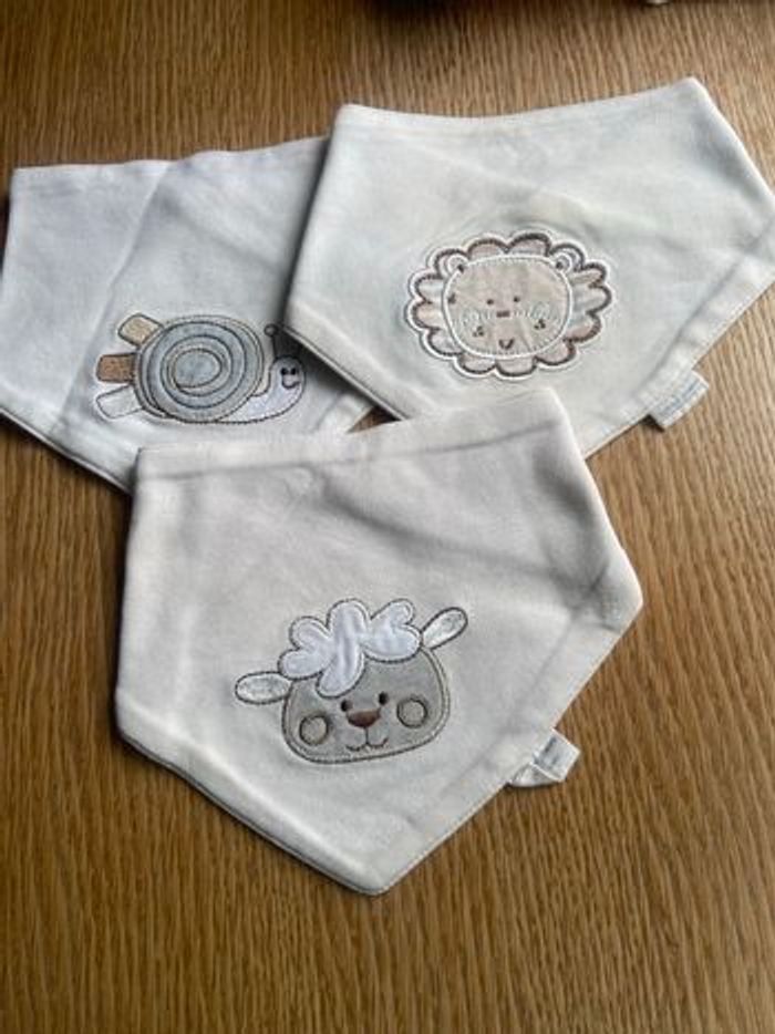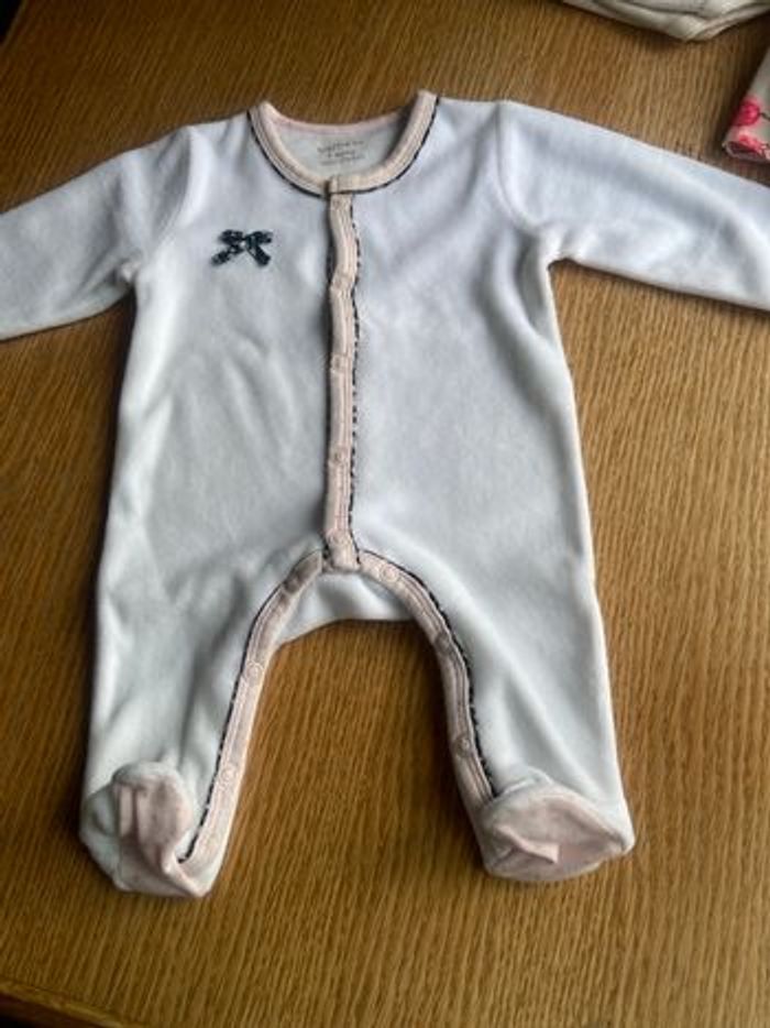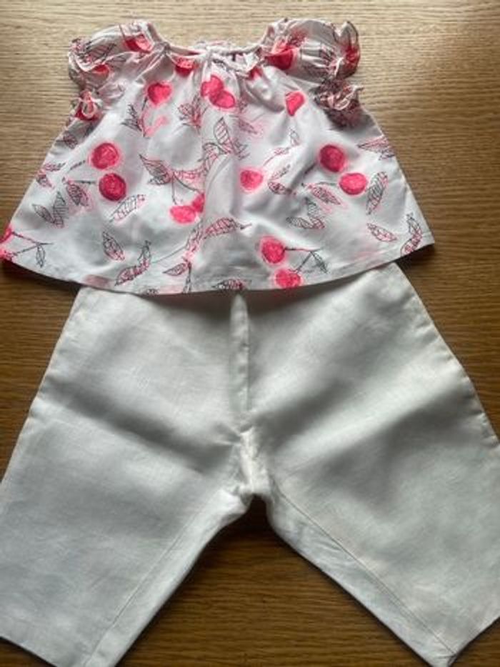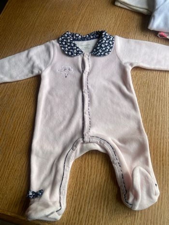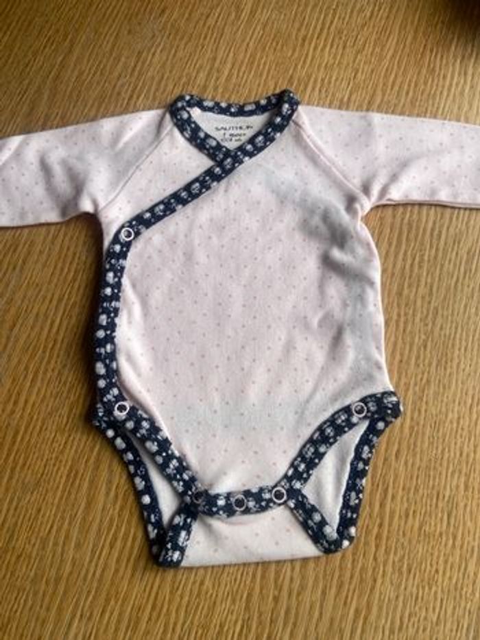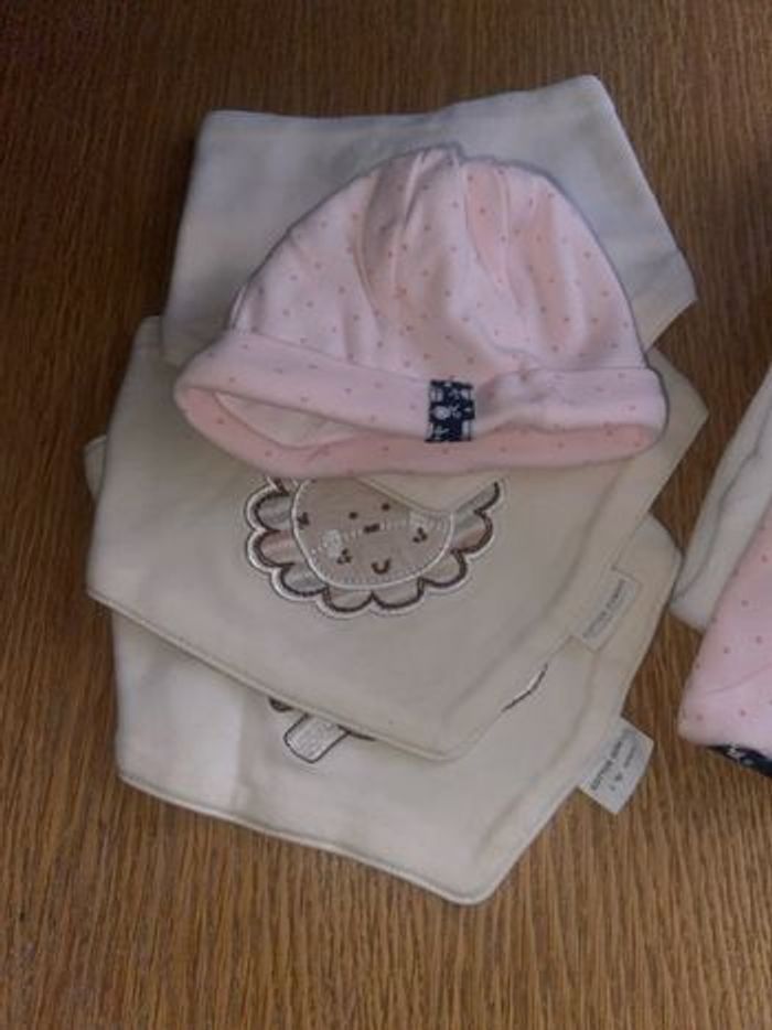 1. ensemble pantalon lin et tunique bonpoint 3mois, 2 pyjamas1 mois marque sauthon , 1body 1mois , 1 bonnet coton assorti, 3 bavoirs à pressions , ( les 4pieces sauthon un rinçage mais jamais porté)