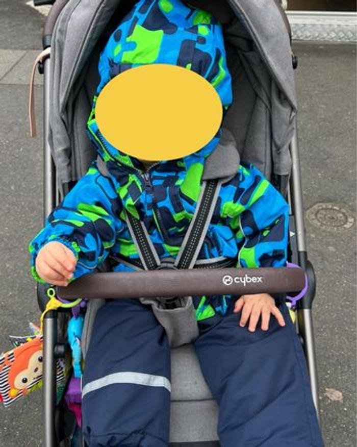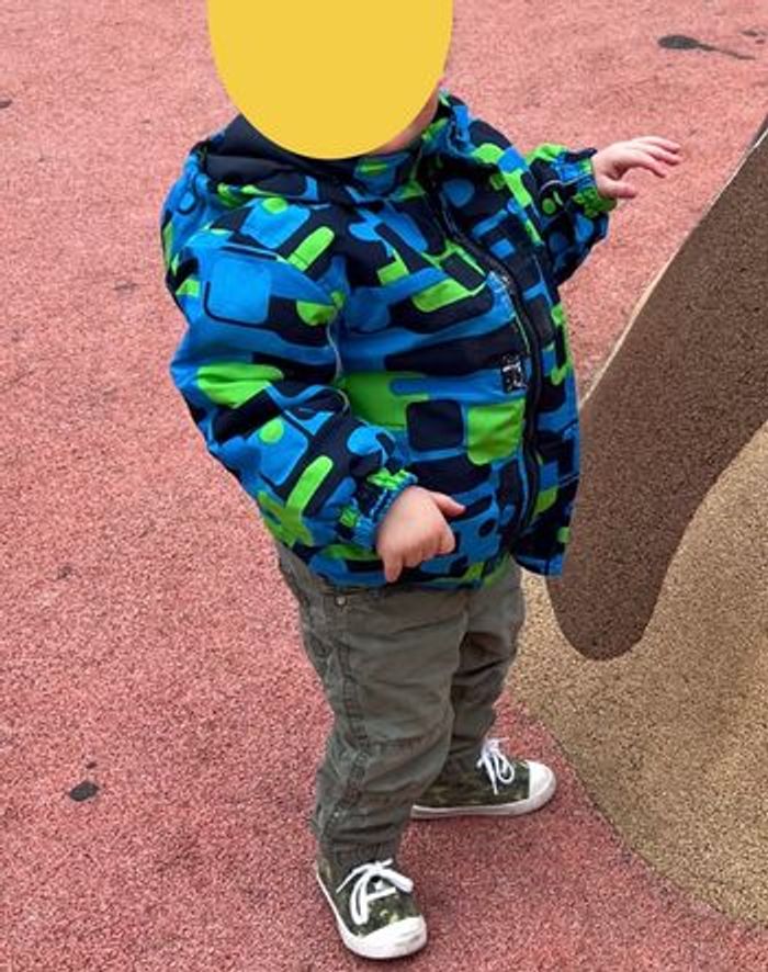 Ensemble doudoune et pantalon froid/neige 80 cm en très bon état Ensemble nordique (Finlande). La doudoune se ferme avec une fermeture éclair et parmenture et scratch pour que le froid ne passe pas au niveau de la fermeture éclair. Scratch au niveau des poches. Capuche amovible et élastique sur le devant pour que la capuche soit plus proche du visage. Ici, elle est porté par un garçon au visage étroit. Les parties grises de la doudoune et du pantalon sont réfléchissantes ce qui est super pour que les enfants soient vus. Sur le pantalon on a eu un problème avec un endroit de la doublure intérieure qu’on a réparée ( voir photo).