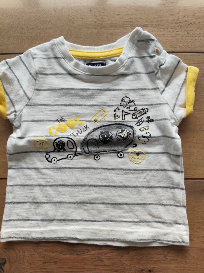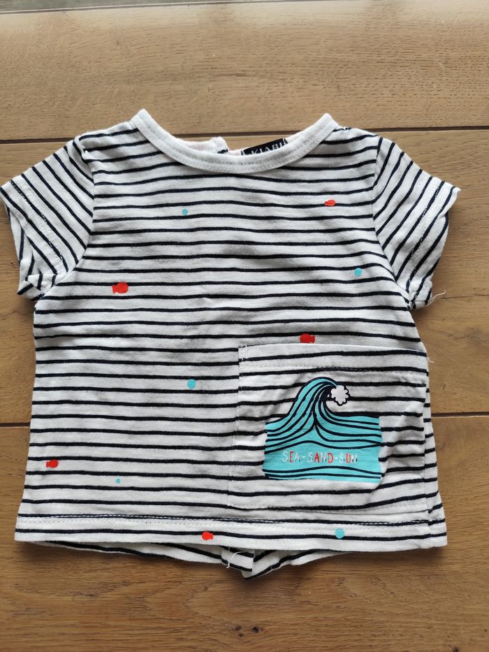Lot de 2 Tee shirts manches courtes garçon Et un sarouel taille 1 mois 2 Tee shirts marque Kiabi dont 1 se ferme dans le dos avec des pressions Sarouel marque Jacadi