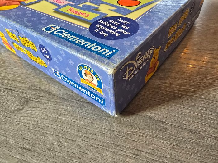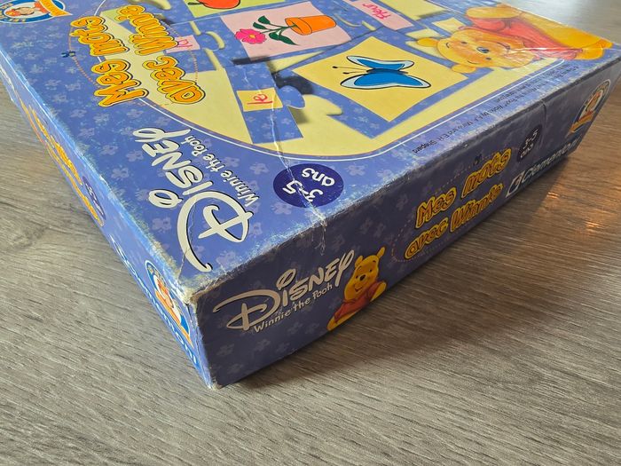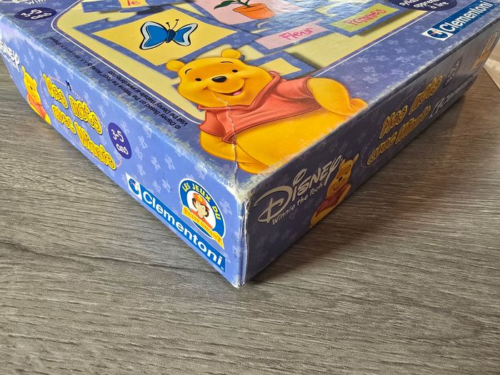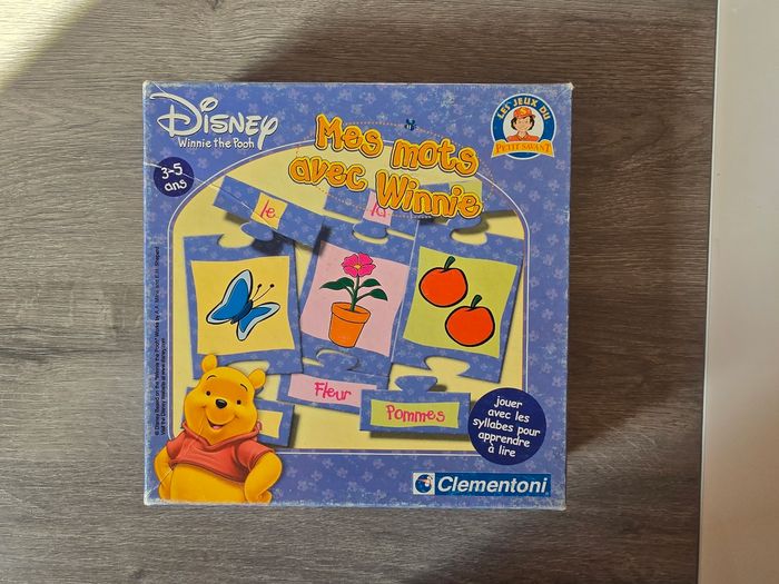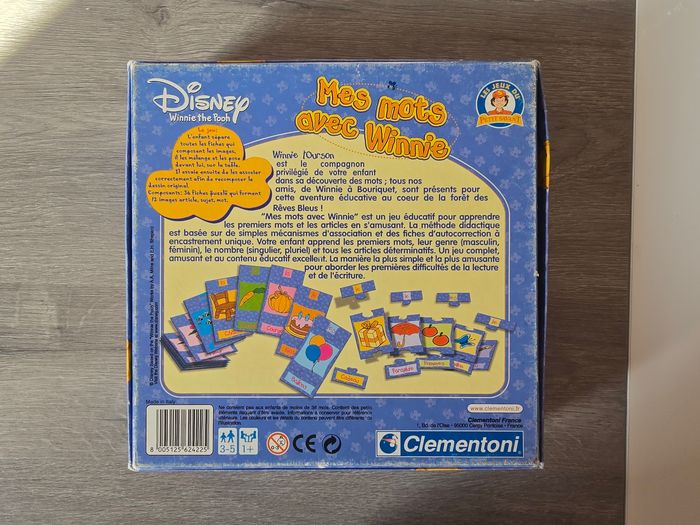 Jeu "Mes mots avec Winnie" Disney. COMPLET. Il a quelques traces d'usures mais aucunes plaques ne sont cassées, pliées ou machouillées (mordus). La boîte a quelques défauts (voir photos). 2€, envoi rapide et soigné.