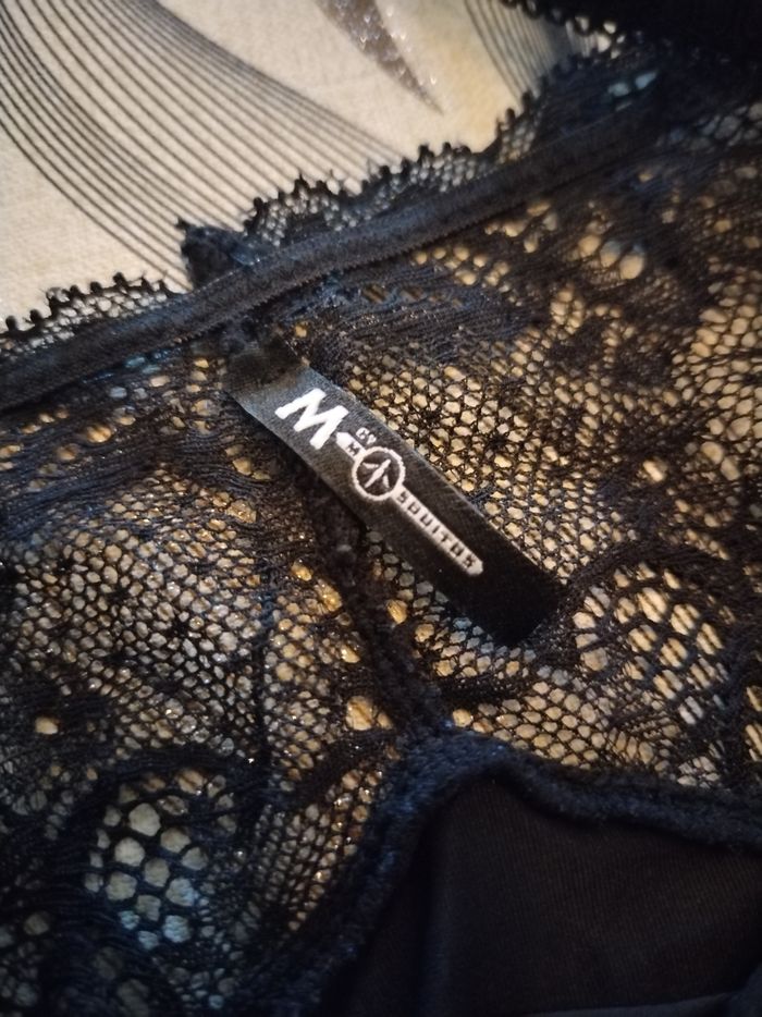 Très jolie nuisette noire avec dentelle et strass au niveau du décolleté. Rembourrage au niveau de la poitrine. Très bon état.