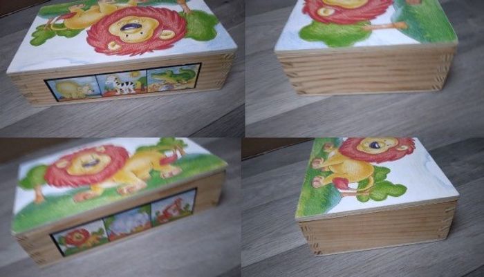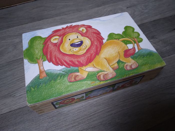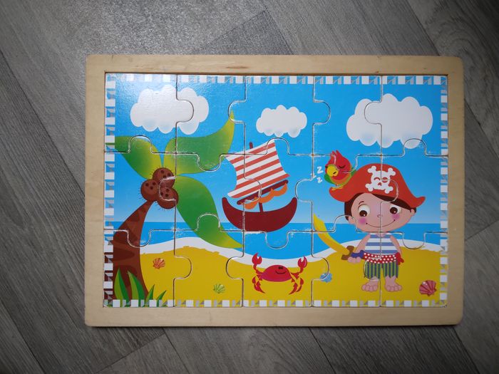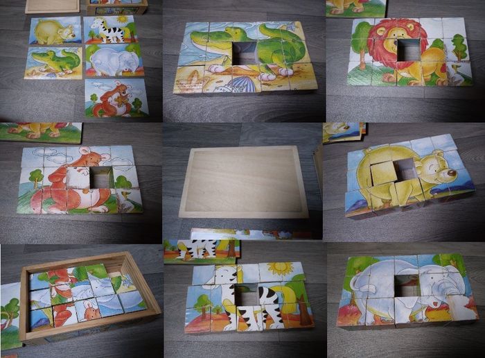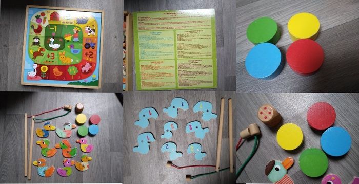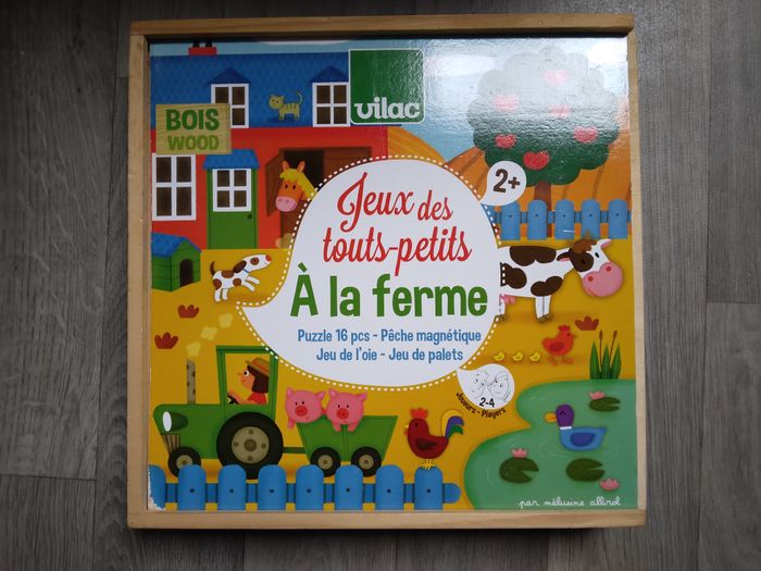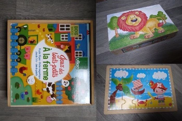 lot de jeux en bois , le bois est en très bon état juste des perte d'images sur les bord - jeux des tout petit à la ferme ; pêche, jeu de l'oie, puzzle, jeu de palets - puzzle pirate - puzzle cube ( manque une pièce )