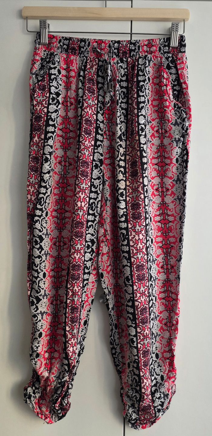 Bas de pyjama de marque Pickaberry, taille S, 100% viscose. Taille élastique avec lanière, motifs multicolores. Longueur: 77cm