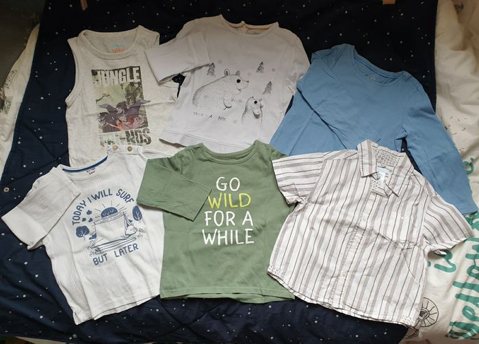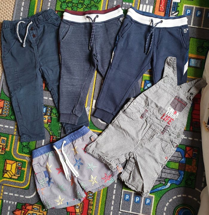 - 2 jogging Okaidi 100% coton - 1 pantalon Tape à l'œil 100% coton ressérable à la taille - 1 salopette Obaibi coton - 1 short de bain Tape à l'œil - 4 T-shirts manches longues coton - 1 chemise manche courte coton - 1 débardeur Disney coton Ensemble en très bon état pour certains quasi neufs peu/pas portés. 2 T-shirt manches longues bon état car traces d'usure discrète.