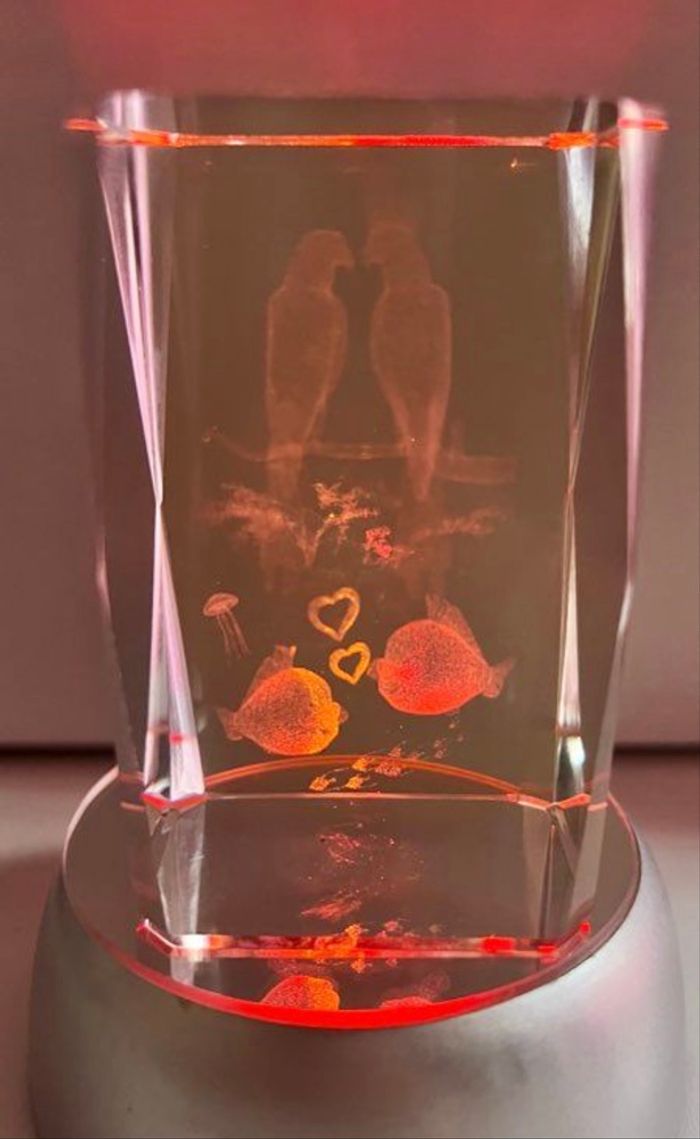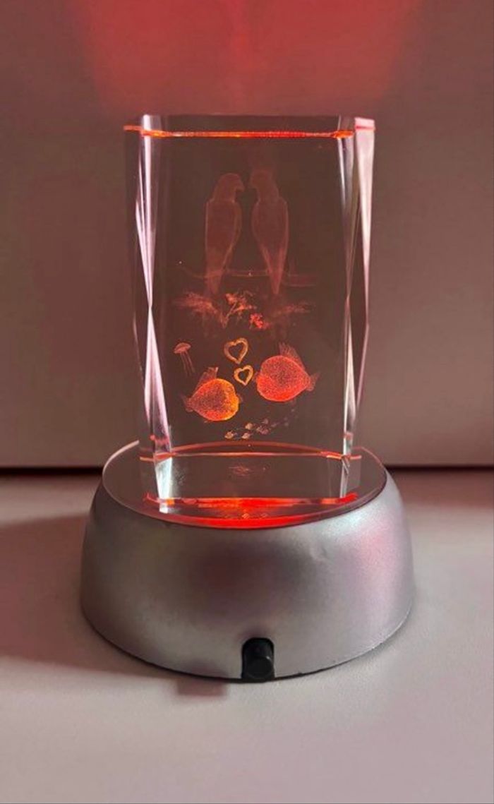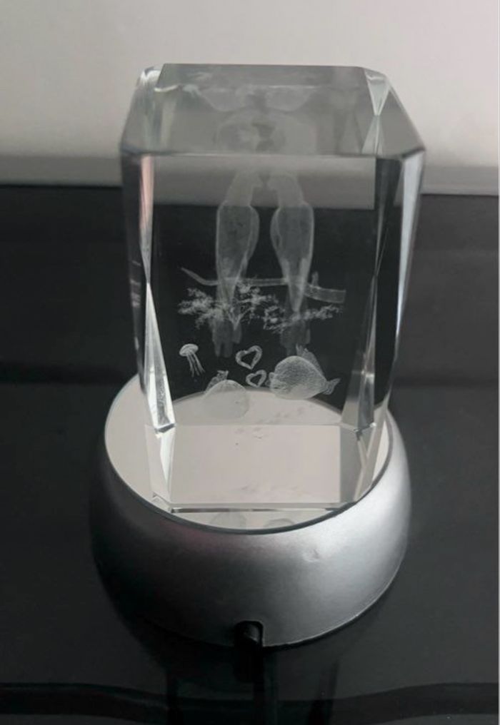 Décoration verre sur socle lumineux neuve Avec gravures couple d'oiseaux, de poissons dans le verre Idéal pour offrir pour les belles occasions à la Saint Valentin ou les anniversaires Pour déclarer votre amour à votre bien aimé Différentes couleurs La décoration est en verre épais plein Vendu dans son coffret Le verre mesure 8 cm de hauteur 5 cm de largeur Le socle mesure 3.5 cm de hauteur 8.5 cm de largeur Fonctionne avec 3 piles LR6 qui ne sont pas fournies (piles normales) À été utilisé juste pour les photos Je réponds rapidement aux messages Envoi rapide et soigné