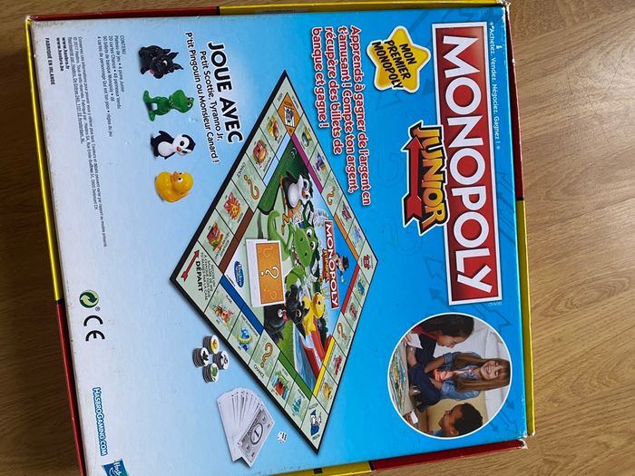Monopoly Junior . Complet sauf sur le petits pions Au lieu de 12 jetons : 10 dinosaures / 11 pingouins / 9 poussins et 12 chiens . On jouait avec 9 jetons pour 3 joueurs A partir de 5 ans