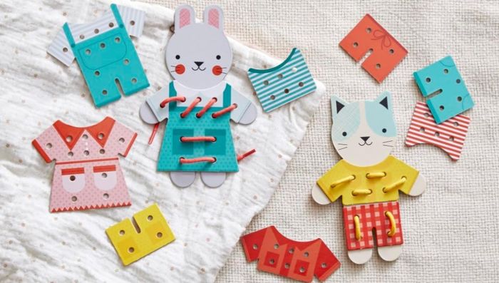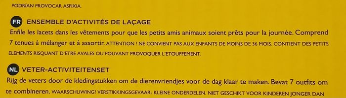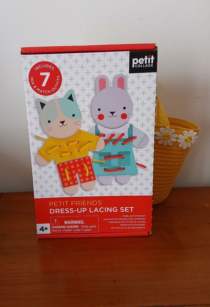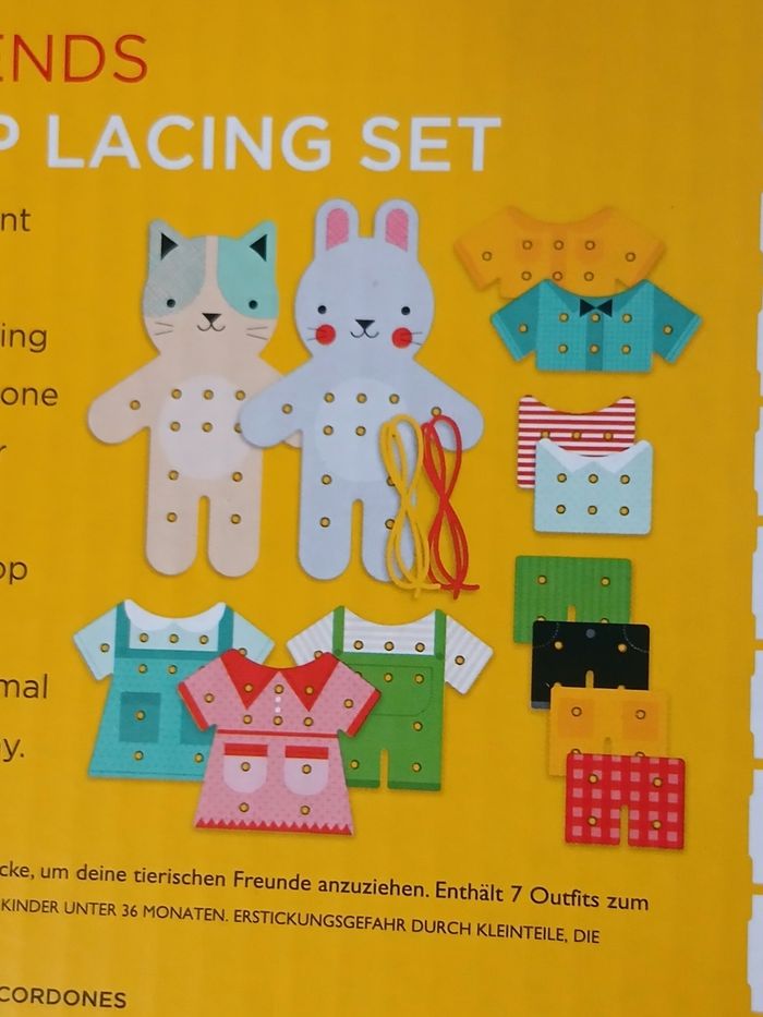 Activité pour enfants de plus de 4 ans d'après le fabricant. Kit de laçage présenté dans un coffret en carton imprimé. Comprend un Chat + un Lapin en carton renforcé + 7 tenues interchangeables + 2 lacets [ schéma descriptif au dos de l'emballage] A Noter : explications en plusieurs langues sur le coffret // voir photos pour détails