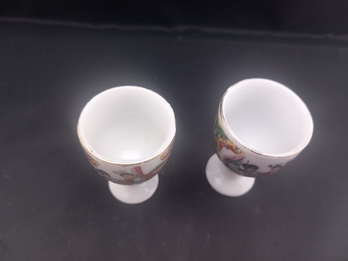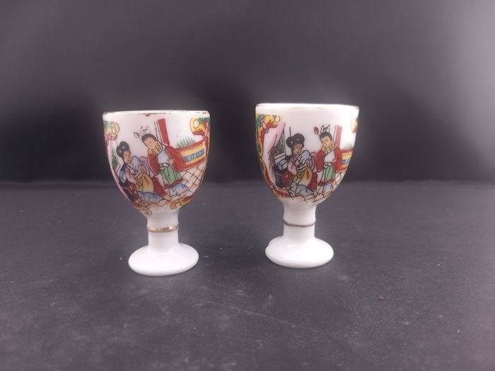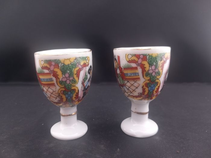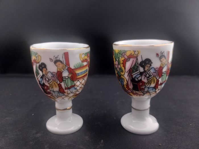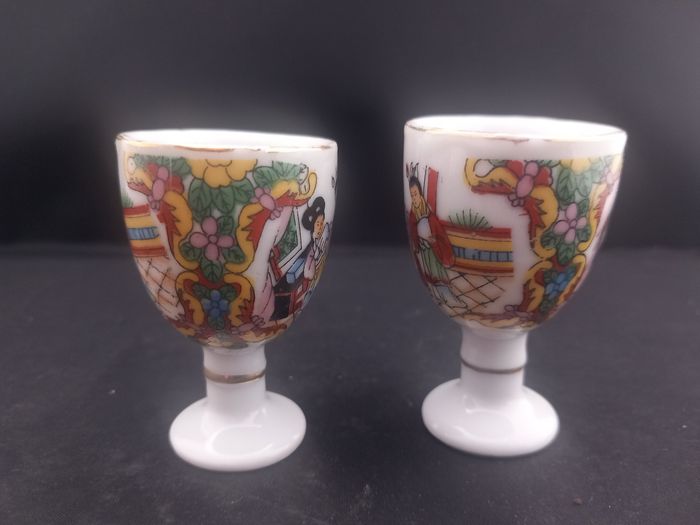 2 Verres à saké Couleurs blanc, doré et multicolore Matière céramique Motifs chinois Dimensions approximative : Hauteur 5,5 cm : 3,5 cm de diamètre En bon état