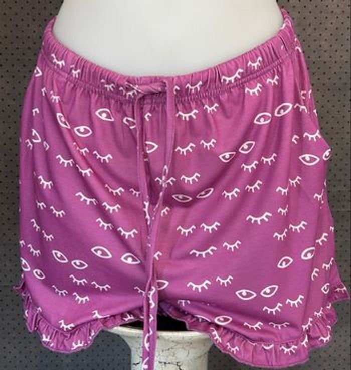 Réductions lots activées (-10 % /-20 % /- 30 %) - voir mon profil Pyjama imprimé mignon - Time to ZZZ, Sweet Dreams, le short avec design à volants, le haut avec ourlet en forme d'arc de couleur rose et violet