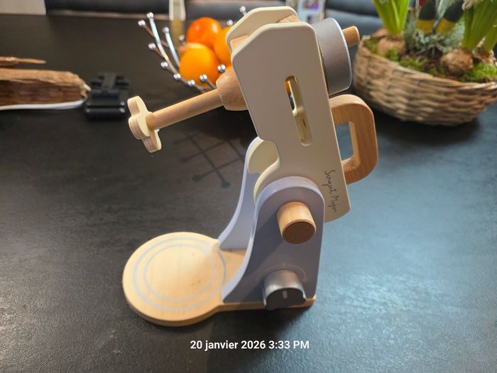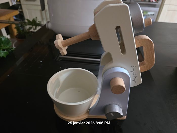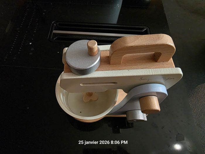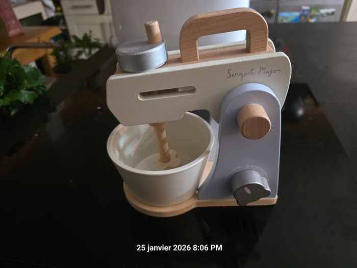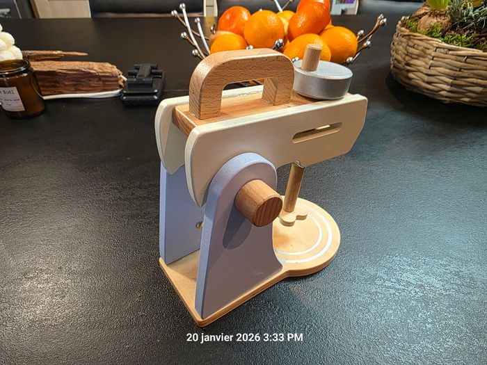 Très joli jouet en bois pour fille ou garçon, idéal pour jouet à la dînette. On peut incliner le mixeur, remplir le bol, tourner le bouton avec un bruit etc .... Comme neuf car utilisé comme décoration par notre fils