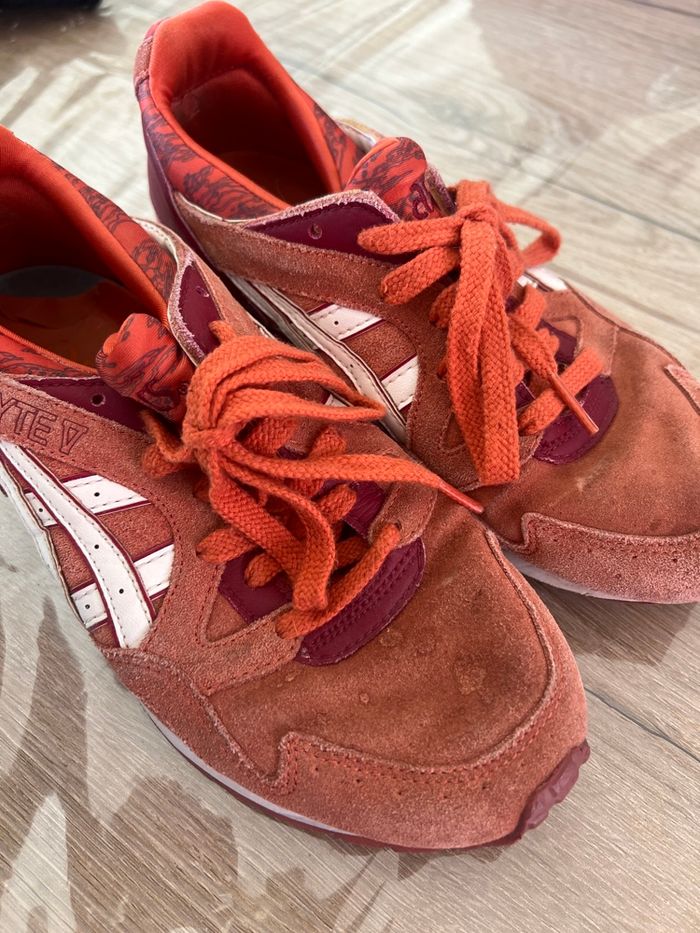 Basket asics orange bordeaux usure de la chaussure sur le dessus ( tache)