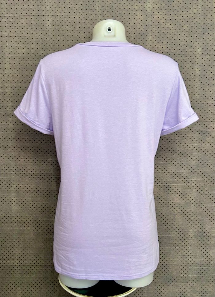 T-shirt femme taille M, couleur lilas - violet tendance, manches courtes retroussées pour un style moderne. Superbe motif tournesol dessiné sur le devant, idéal pour apporter une touche originale à tes tenues. Col rond confortable, coupe droite flatteuse et tissu agréable au toucher. Ce T-shirt est parfait pour un look décontracté chic, à associer avec un jean, un short ou sous une veste légère. Convient pour les sorties, vacances ou moments de détente. • Mesures à plat : • Poitrine : 49cm • Longueur totale (prise depuis le col au dos jusqu'en bas) : 72cm Mesures indicatives, une légère variation est possible.