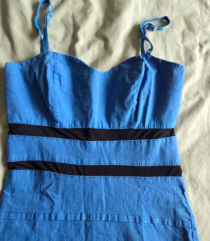 ​✨ ÉTAT : Bon état. La couleur bleue est encore très belle, mais à noter quelques défauts au niveau des coutures sur le bas de la robe (visibles sur les photos). ​📏 TAILLE & COUPE : Taille M. Coupe ajustée avec bretelles réglables. Détails de bandes contrastées et étages de tissus sur la jupe. ​🌿 MATIÈRE : 77% Rayonne, 20% Polyamide, 3% Élasthanne. Matière fluide et légèrement stretch, fabrication italienne. ​📦 LIVRAISON : Envoi via Mondial Relay (lockers), Shop2Shop ou Chronopost (point relais physique). ​🎁 Réductions sur les lots activées ! Profitez-en pour optimiser vos frais de port.