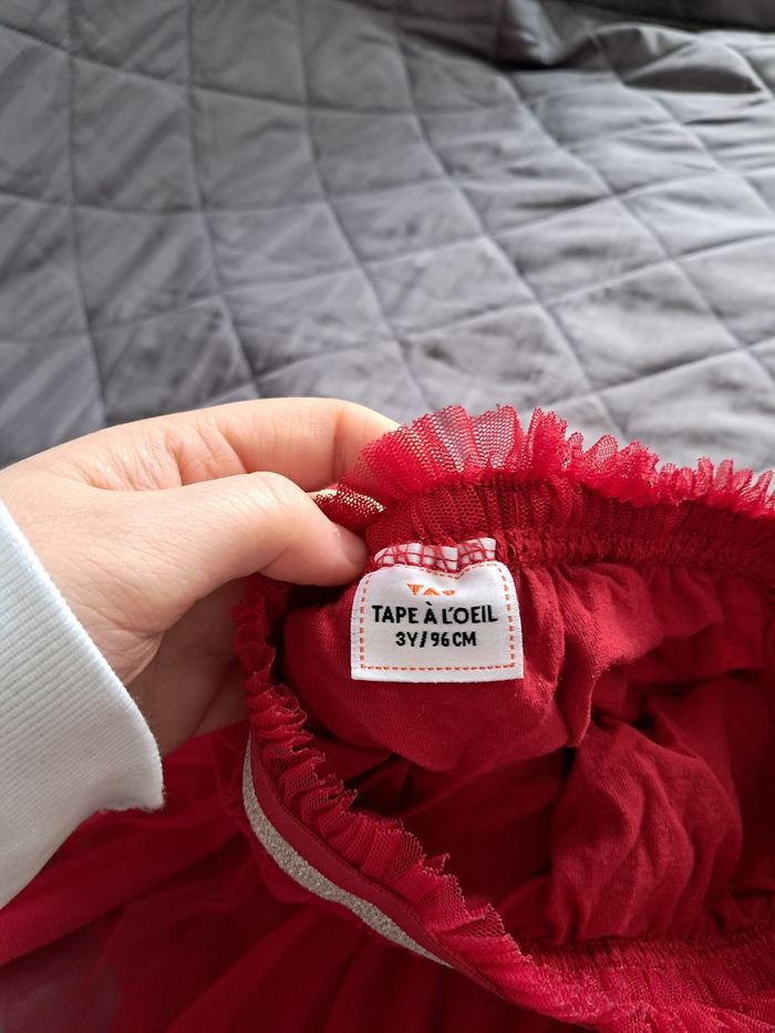 Jupe en tulle rouge festif - Tape à l'Œil (3 ans) Adorable jupe style "tutu" de la marque Tape à l'Œil. Parfaite pour les fêtes, un anniversaire ou simplement pour jouer à la princesse ! ​Couleur : Rouge vif éclatant. ​Détails : Taille élastiquée avec un joli liseré pailleté doré/argenté pour un maintien confortable. ​Matière : Plusieurs épaisseurs de tulle souple avec une doublure en coton pour ne pas gratter. ​Taille : 3 ans (96 cm). ​État : Très bon état, peu portée. ​Maison non-fumeur. Envoi rapide et soigné ! 🚀 ​ ​#tapegloeil #tao #juperouge #redskirt #tutu #jupefille #vêtementsenfant #modeenfant #tulleskirt #tenuedefete #noel #christmasoutfit #lookprincesse #fille3ans #girlsfashion