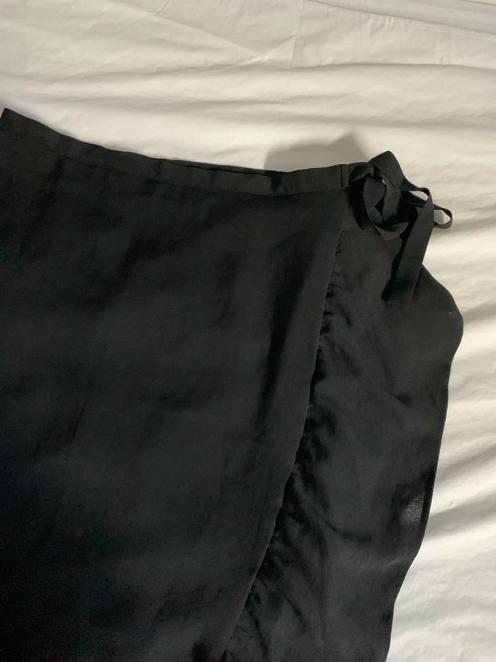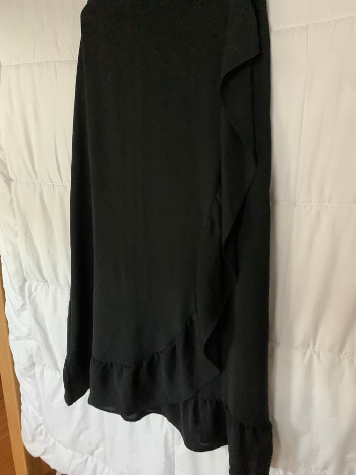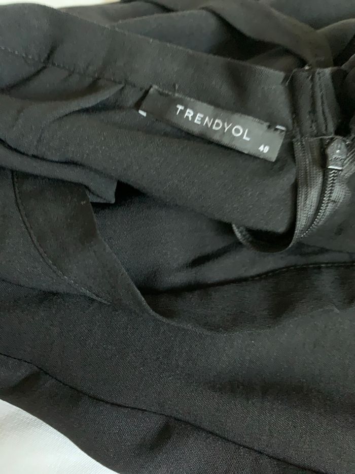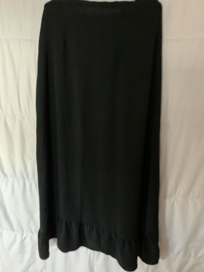 Jupe longue noire Volant à la base qui remonte jusqu’à la taille Taille 40 Marque Trendyol Longueur 95 cm Se ferme par une fermeture et un noeud sur un côté