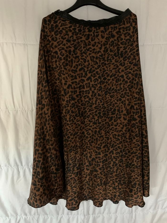 Jupe longue imprimée léopard marron et noir Taille 40 Plus d’étiquette Longueur 85 cm Largeur taille 34 cm Tissu fluide (polyester) et bande en similicuir à la taille légèrement abîmée Se ferme par un bouton et une fermeture sur un côté