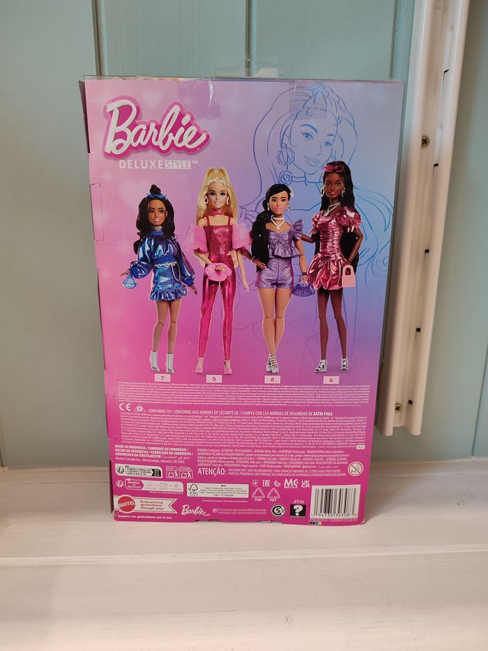 Avec ces poupées Barbie Deluxe Style, le style glamour atteint de nouveaux sommets grâce à des tenues éblouissantes et des accessoires haut de gamme qui misent sur un effet métallisé ! Cette poupée Barbie est vêtue de rose scintillant de la tête aux pieds ! Son haut métallisé étincelant de type corset est adouci par des manches en organza léger qui semblent flotter au-dessus de ses épaules. Le pantalon assorti complète parfaitement son look élégant, tandis que sa coiffure en demi-queue de cheval met en valeur ses grosses boucles d’oreilles et son collier rose. La poupée Barbie porte des bracelets superposés, une pochette orné d’un nœud et des chaussures à talons roses. La poupée est articulée pour que les enfants puissent lui faire prendre toutes sortes de poses !