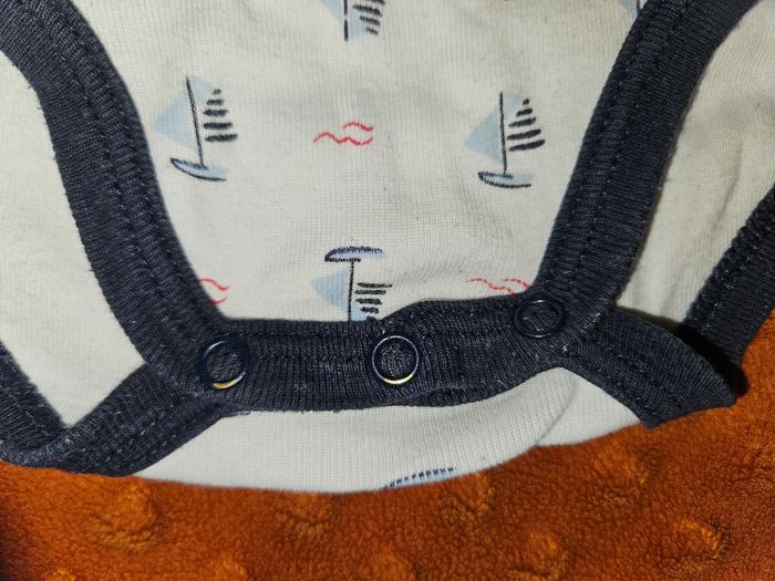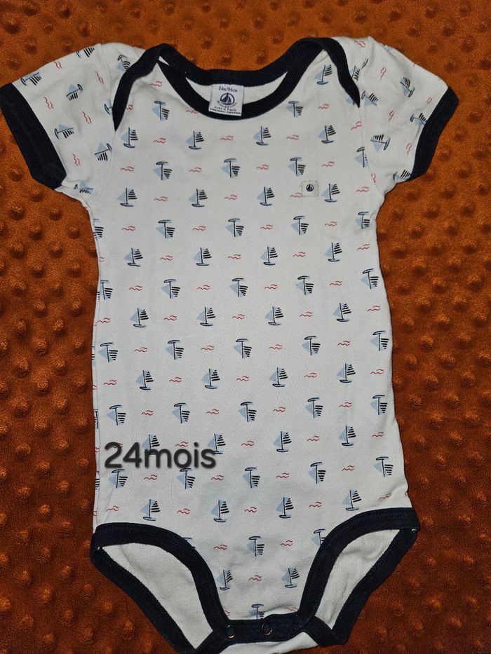 Body manches courtes ( MC ) petit bateau taille 24mois (86 cm), motif bateau. Bon état, la couleur est un partie sur la pression (voir 2e photo), sans trou ni tâche D'autres vêtements sont disponibles dans mon dressing en taille 24mois