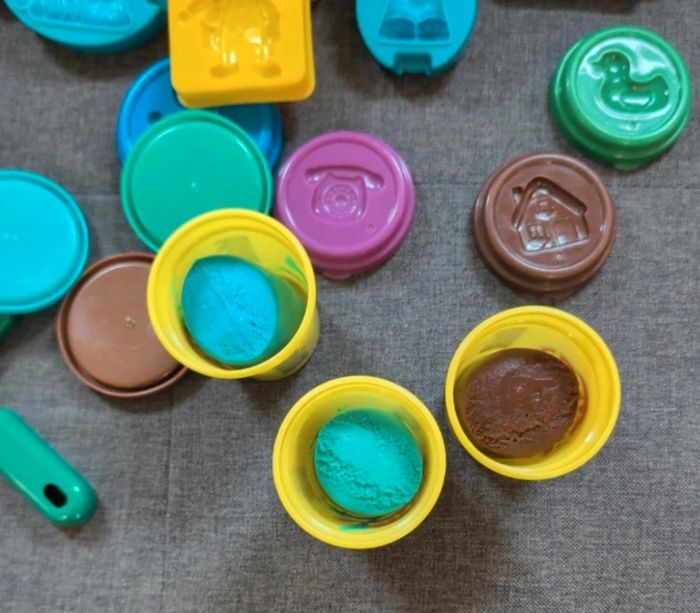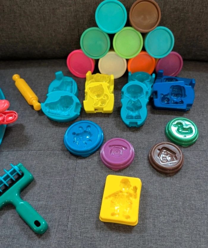 15 pots neuf (voir photo) de pâte à modeler avec des accessoires divers en très bon état (les étiquettes sont fatiguées mais rien de méchant), gaufrier, salon de coiffure, moules animaux, personnages, etc...