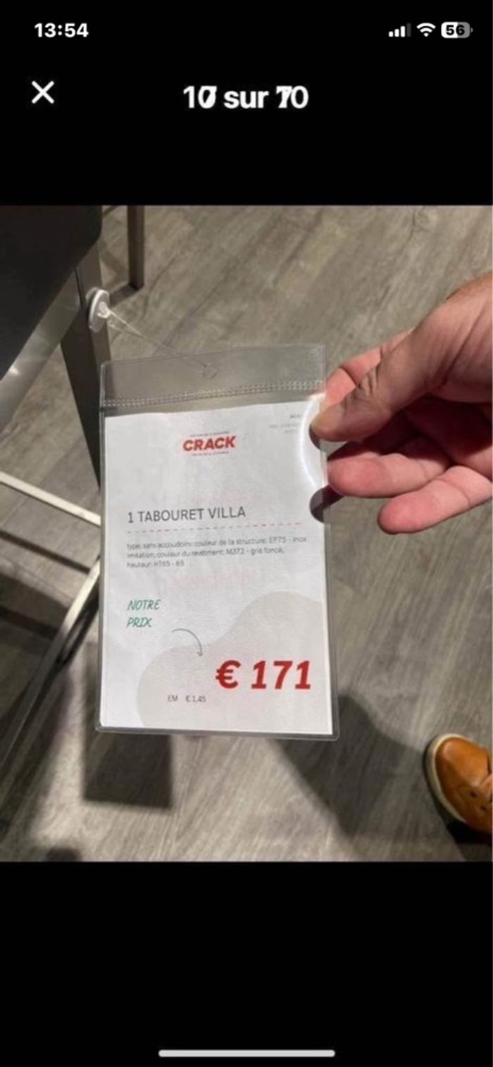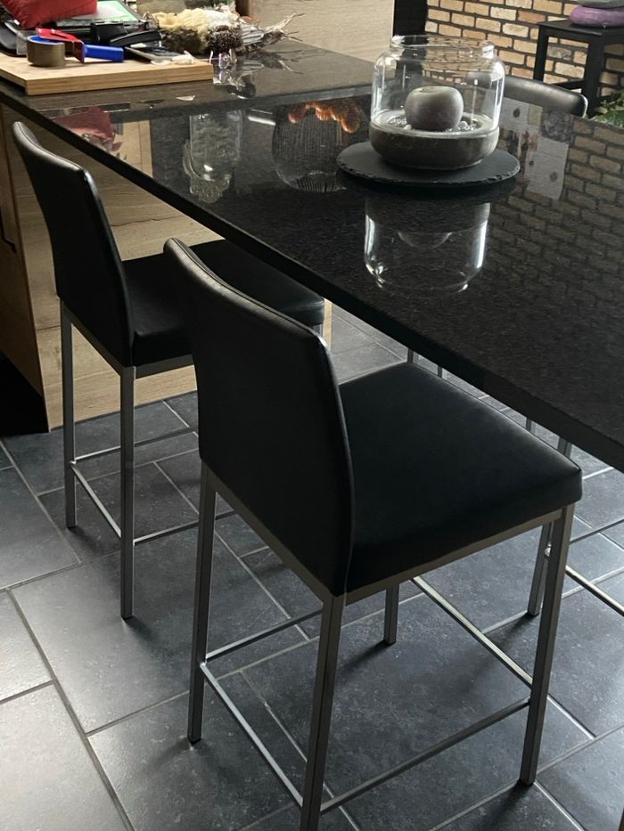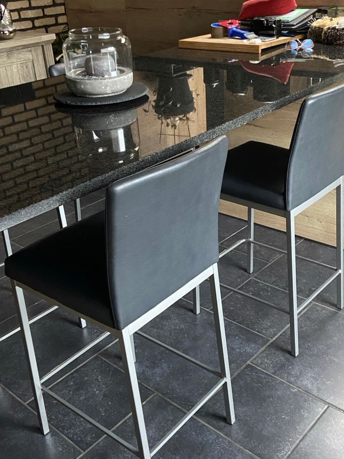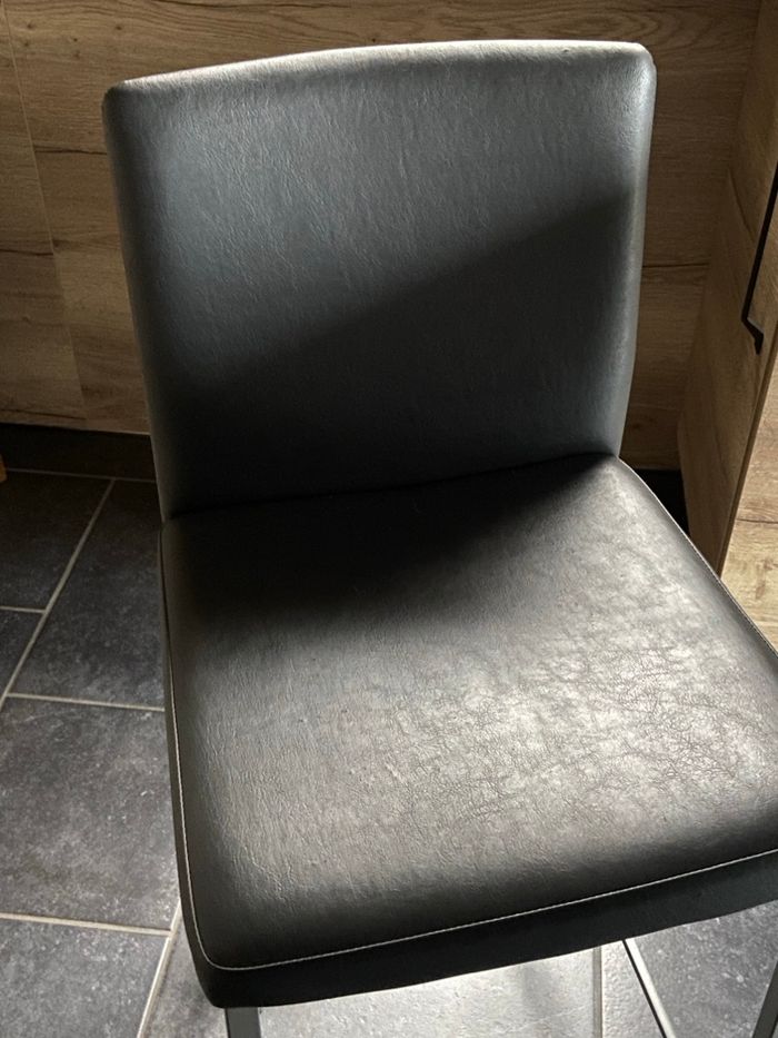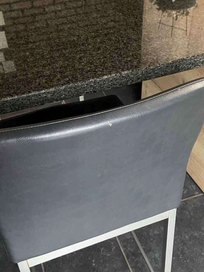 Vends 4 chaises hautes en similicuir anthracite Hauteur des chaises, l’assise 64 cm Quelques petits accrocs mais rien de méchant Achat chez Crack au prix de 169 euros à l’époque