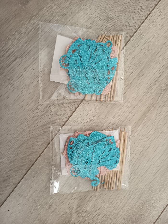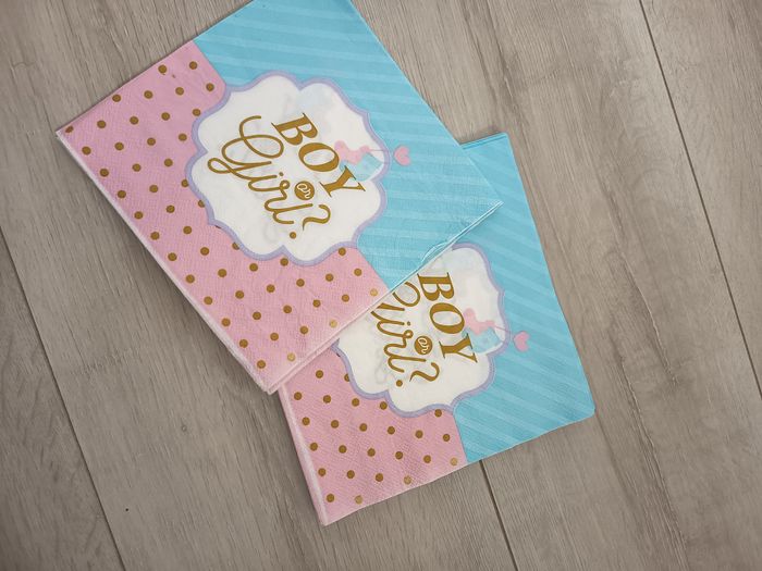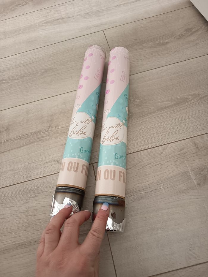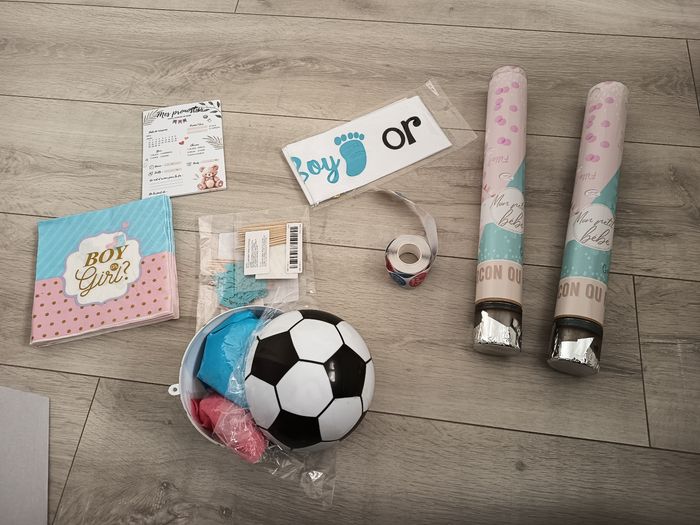 Vend lot d'articles neuf pour la révélation du sexe de bebe. Le lot est composé de: - 2 canon confettis ( rose ) -étiquette fille ou garçon( le rouleau est presque plein il y as que 20 étiquettes de parti) -écharpe encore en plastique -ballon avec poudre avec en carton -14 serviette papier -5 fiche pronostic - 24 pique