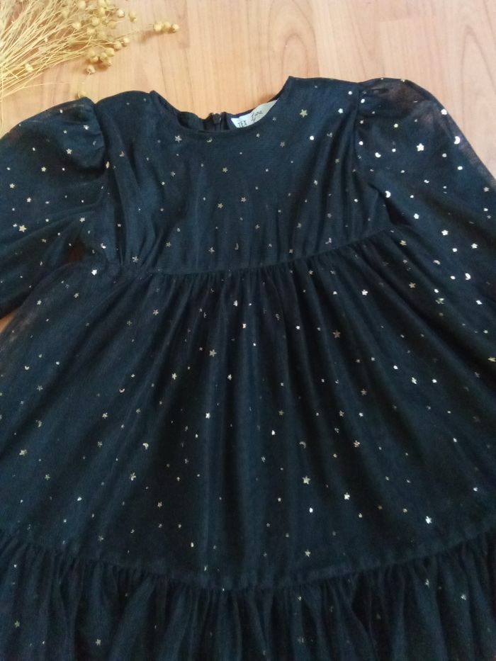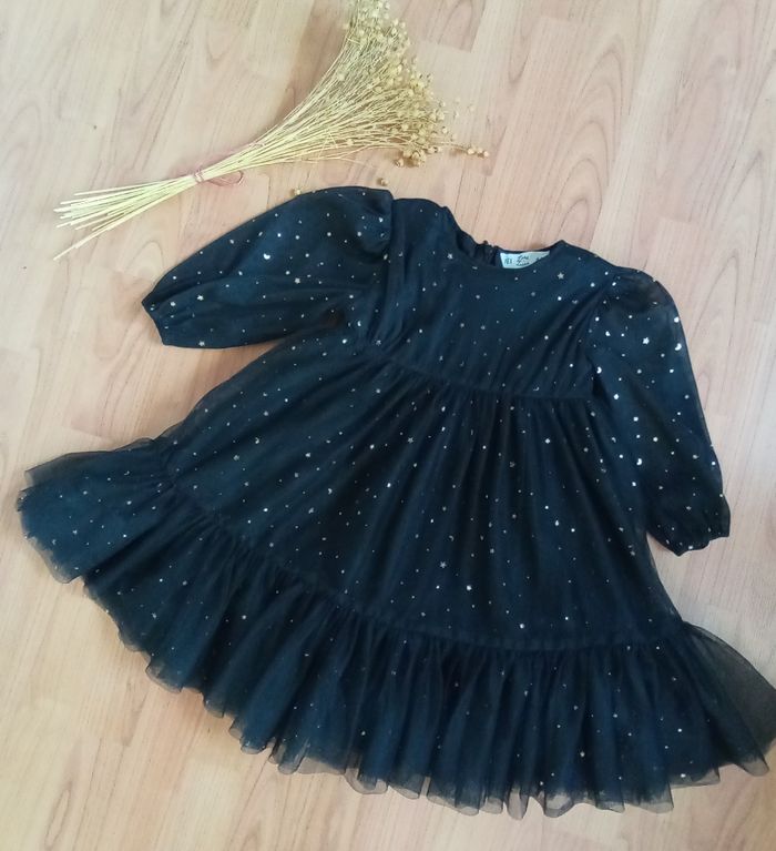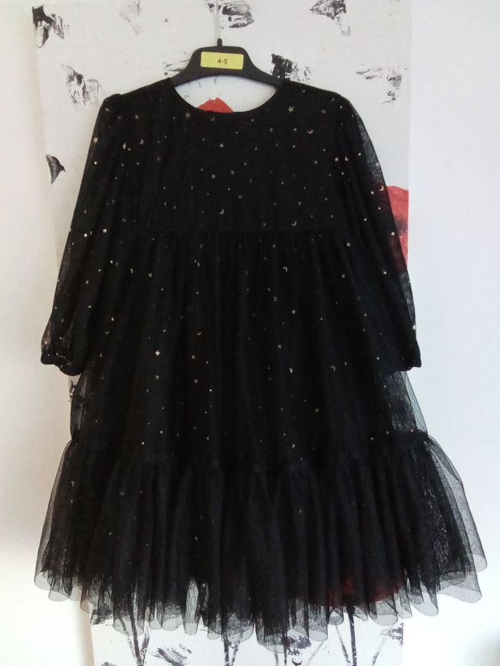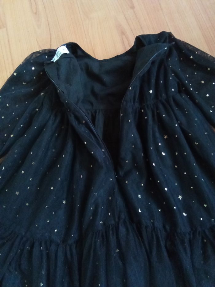 🌼 Belle robe noire avec ses volants et ses 4 épaisseurs : 1 premier rang de tulle noire, 1 second en tulle avec strass étoiles dorées, 1 troisième en tulle noire et 1 quatrième pour la doublure (cette succession d'épaisseurs donne un beau volume) 🌼 Manches en tulle transparent avec strass étoiles dorées 🌼 Fermée au dos par zip 🌼 100% polyester - doublure 100% coton 🌼 Idéale pour une occasion, très jolie rendu portée 🌼 1ere main 🌼 Taille 4/5 ans