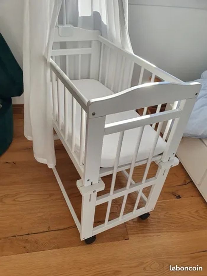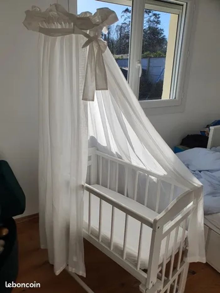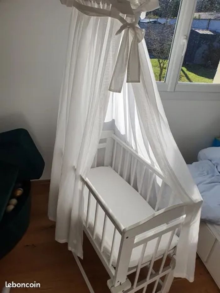 Description Je vends ce magnifique berceau blanc avec le baldachin blanc. Universel pour une fille ou garçon. Le lit est taille 45x85cm sur les roulettes ou la berceuse. Marque Monsieur bébé. Pour état impeccable à prévoir de la peindre car les petits imperfections sont visibles. Baldachin Marque Quax. Le matelas en excellent état 2 alaise pour protéger le matelas 2 draps blanc. A venir chercher sur Soussans