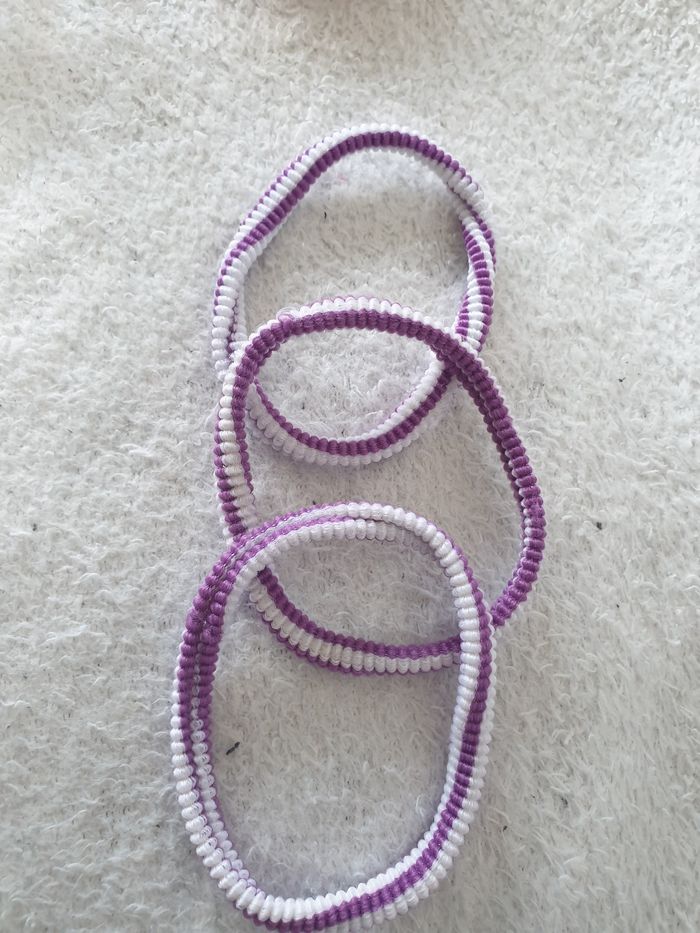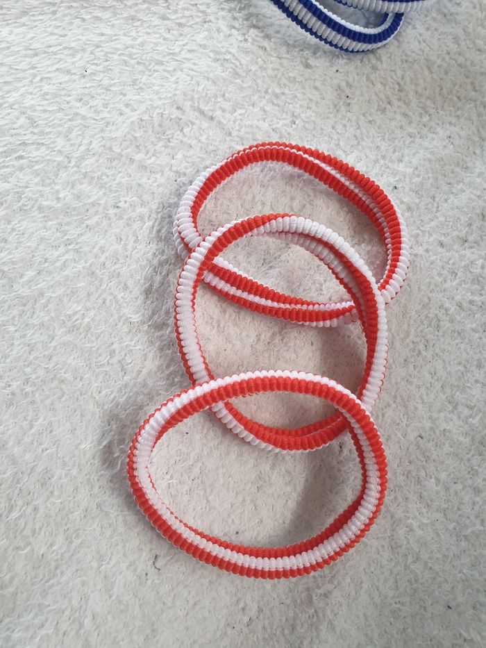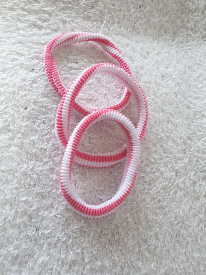 Lot de 12 élastiques pour cheveux. 3 bleus et blancs, 3 rouges et blancs, 3 roses et blancs et 3 violets et blancs. Parfait état.