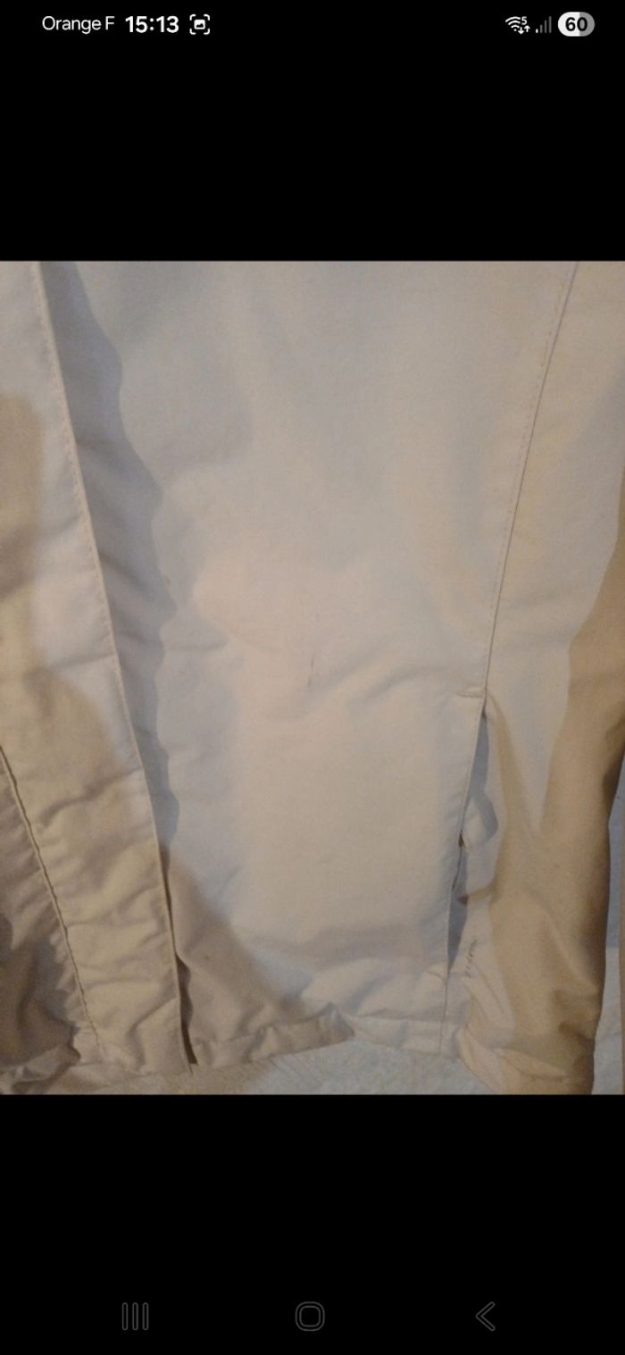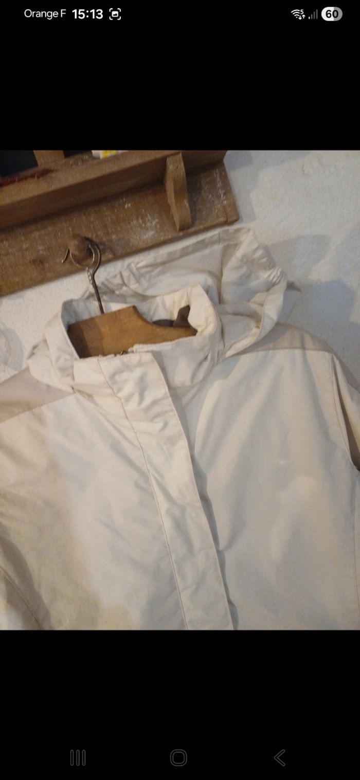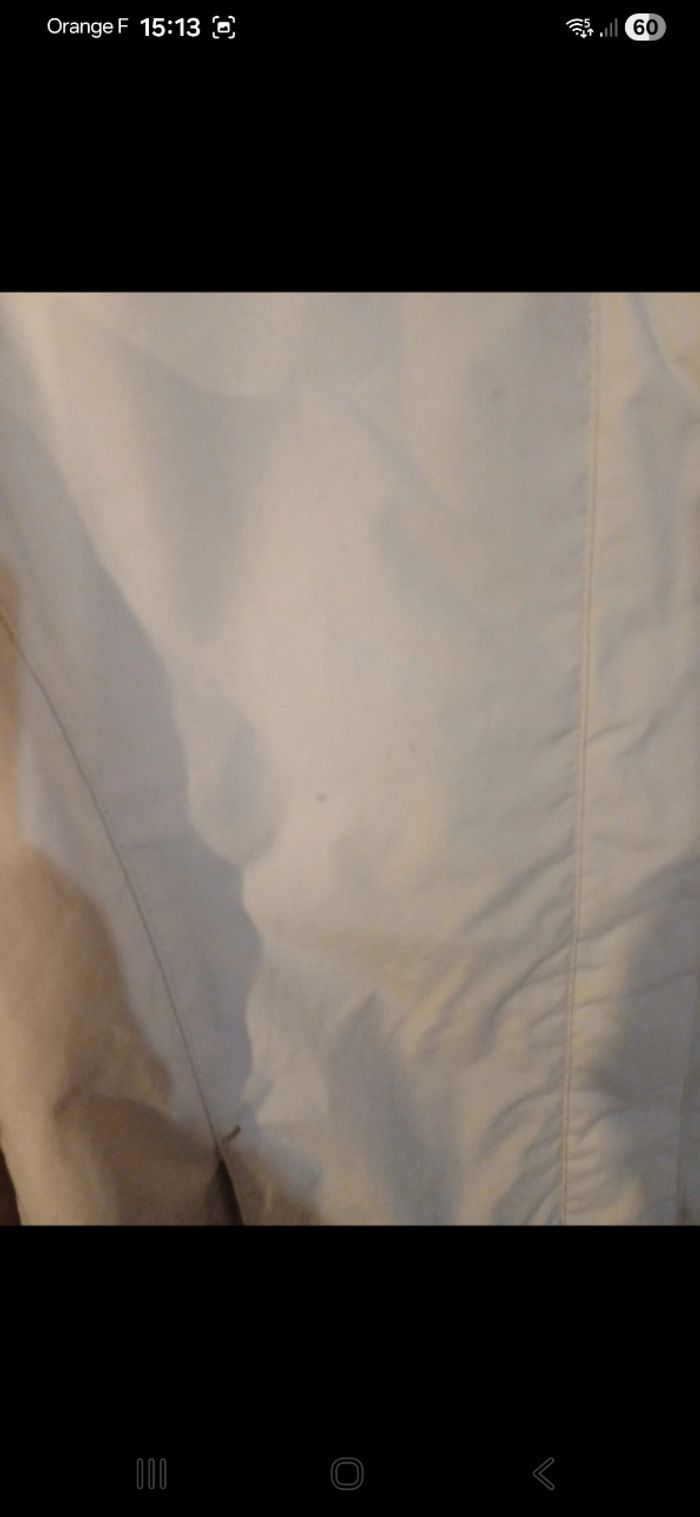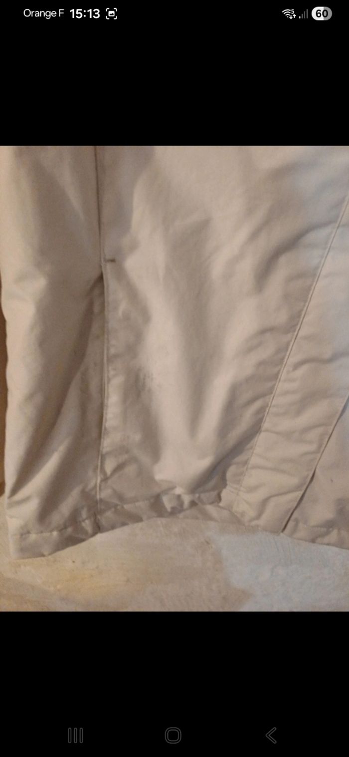 Blouson de ski avec capuche qui se range au niveau de la nuque. Deux poches zippées à l avant, une autre sur la manche et une intérieure. Zippée à l avant avec scratchs par dessus. En bon état mais malheureusement de nombreuses tâches sur l avant. ( voir photo)