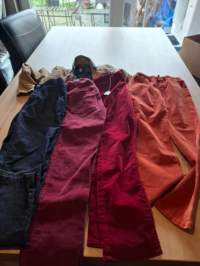 Lot avec 4 pantalons en velours 10 ans en très bon état okaidi, tex, orchestra Une veste gastro 8 ans en tres état. Possibilité a la pièce