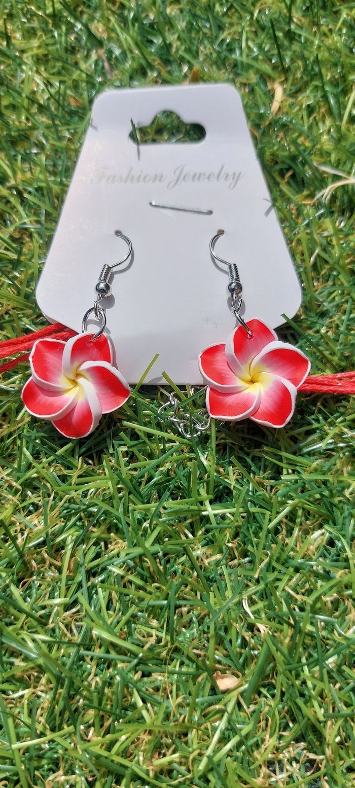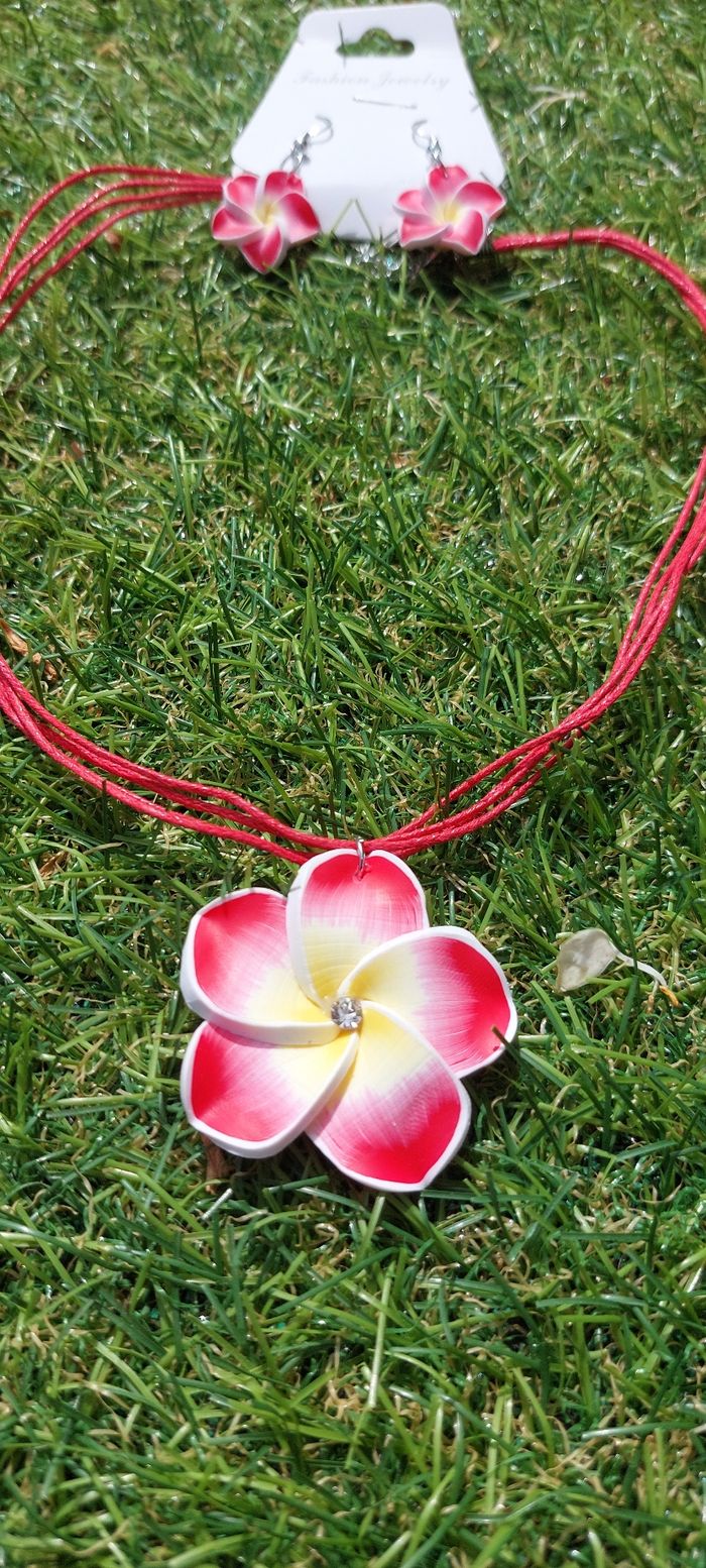 Collier ficelle + fleur frangipanier Couleur rouge Ficelle 40 cm environ Fleur en argile polymère 4 cm de diamètre Boucles d'oreilles fleur de frangipanier En argile polymère Fleur : 3 cm de diamètre Couleur rouge et blanc Fermeture crochet #parure #collier #boucledoreille #pendants #fleur #Hawai #polynesie #tahiti #argilepolymere