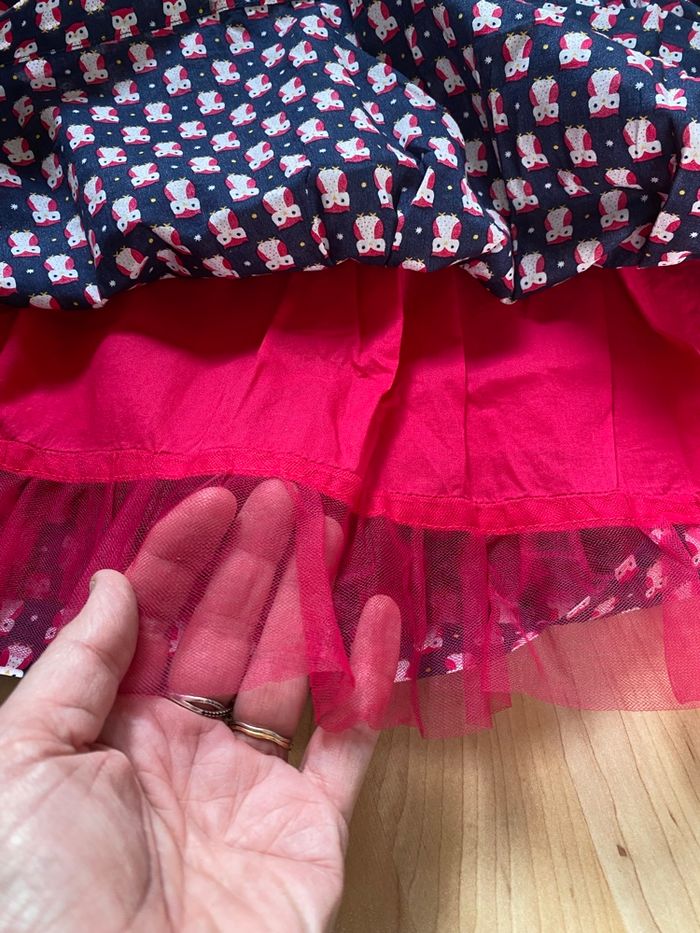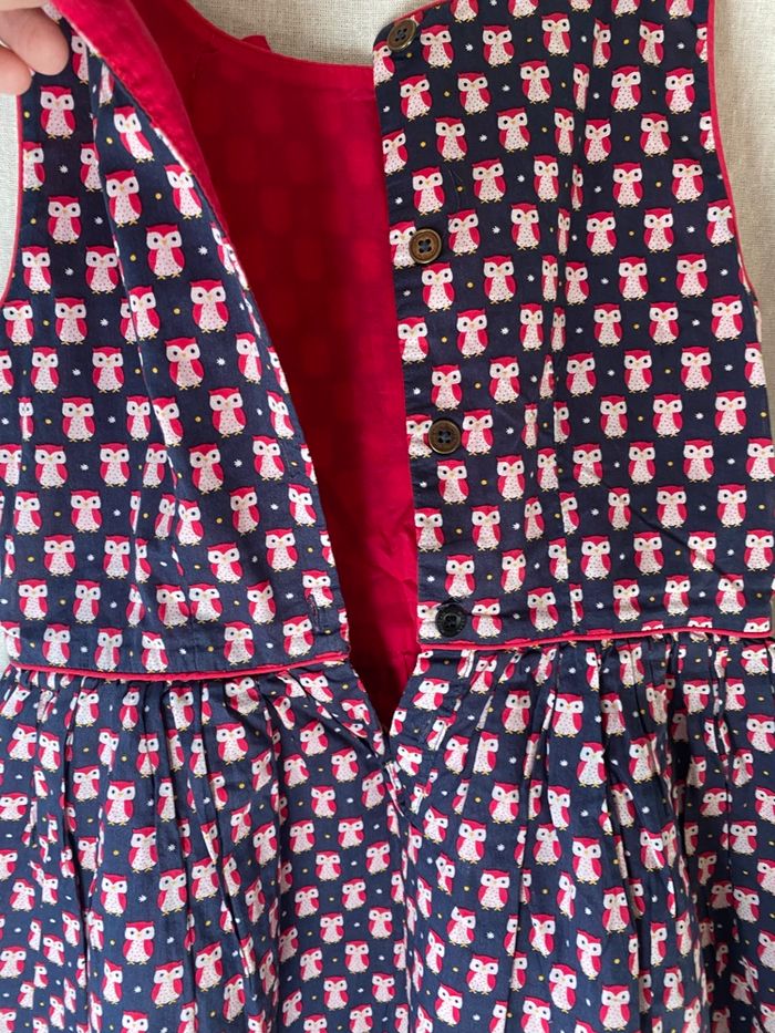 Robe « Sergent Major » 8 ans (128cm) marine avec motif: chouettes. Robe sans manche, doublée rouge avec un volant qui ne se voit pas Robe comme neuve