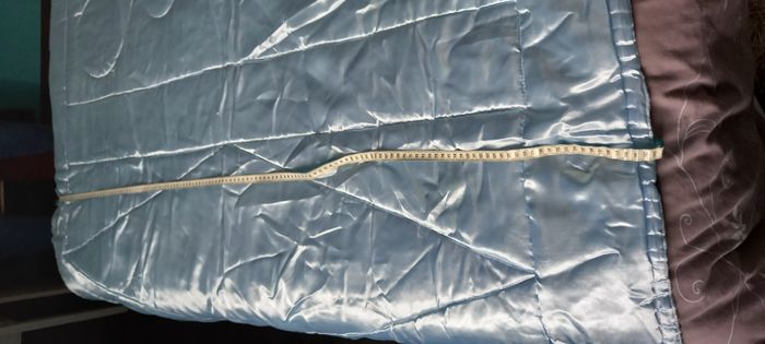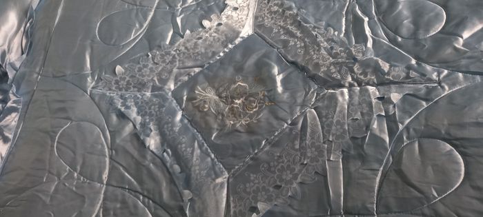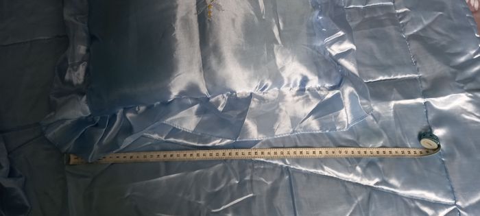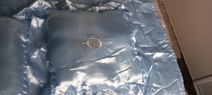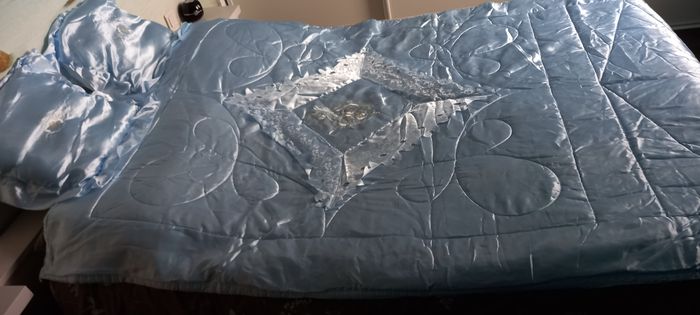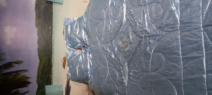 Couvre lit satiné Coloris bleu ciel avec broderie 2 coussins assortis Pour lit de 140 Dimensions coussins 48 cm x 48 cm Dimensions couvre lit 143 cm x 212 cm #lingemaison_imoddeco