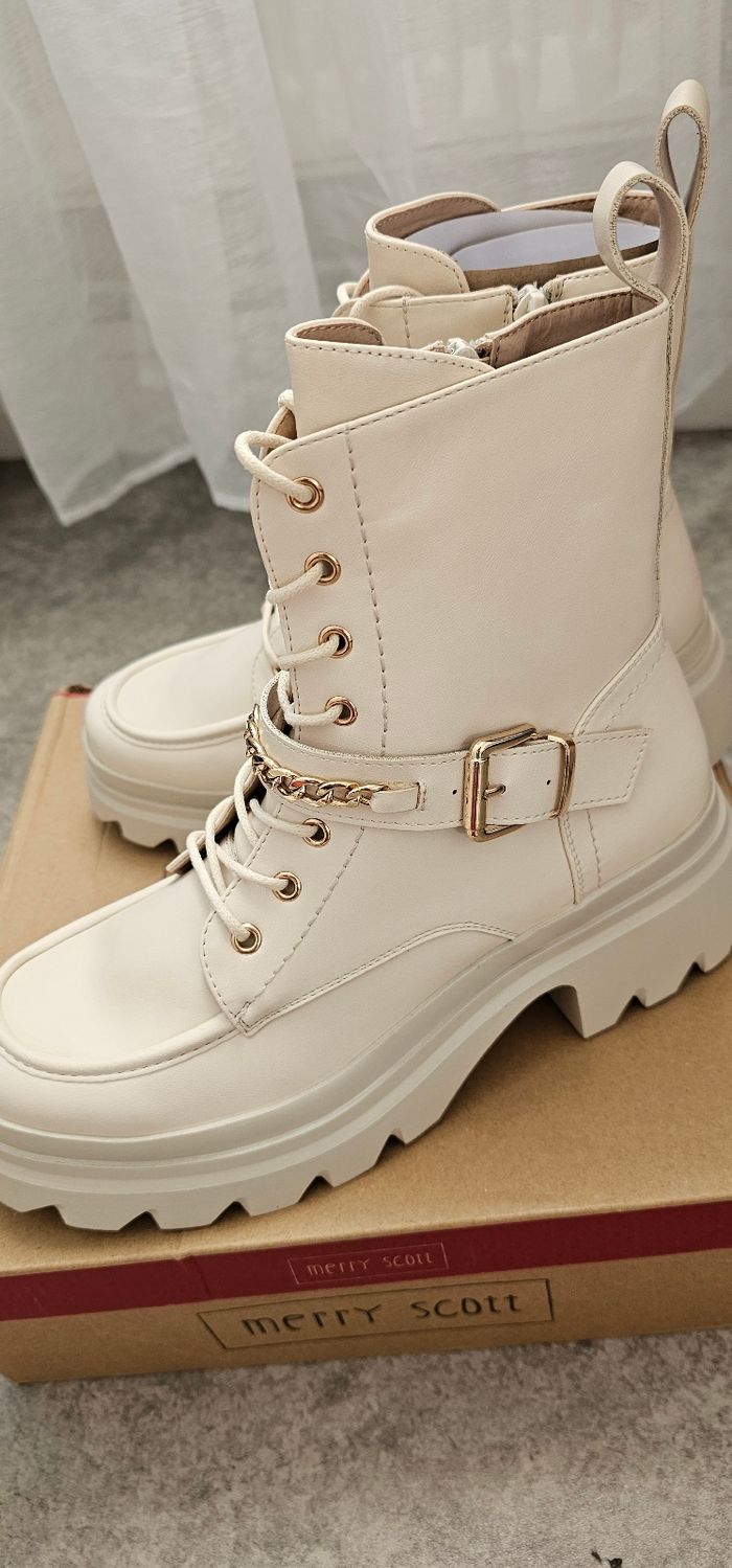 Superbes bottines couleur beige/crème avec semelle plateforme épaisse. Chaîne dorée élégante sur le devant, lacets ajustables et fermeture éclair sur le côté pour un enfilage facile. Très confortables et ultra tendance, parfaites pour l’automne/hiver ou un look moderne. 👉 Taille : 39 👉 État : Neuves, jamais portées N’hésitez pas à me contacter pour plus d’informations 😊 #bottines #taille39 #chaussuresfemme #plateforme #beige #tendance #modefemme #automnehiver#lookurbain