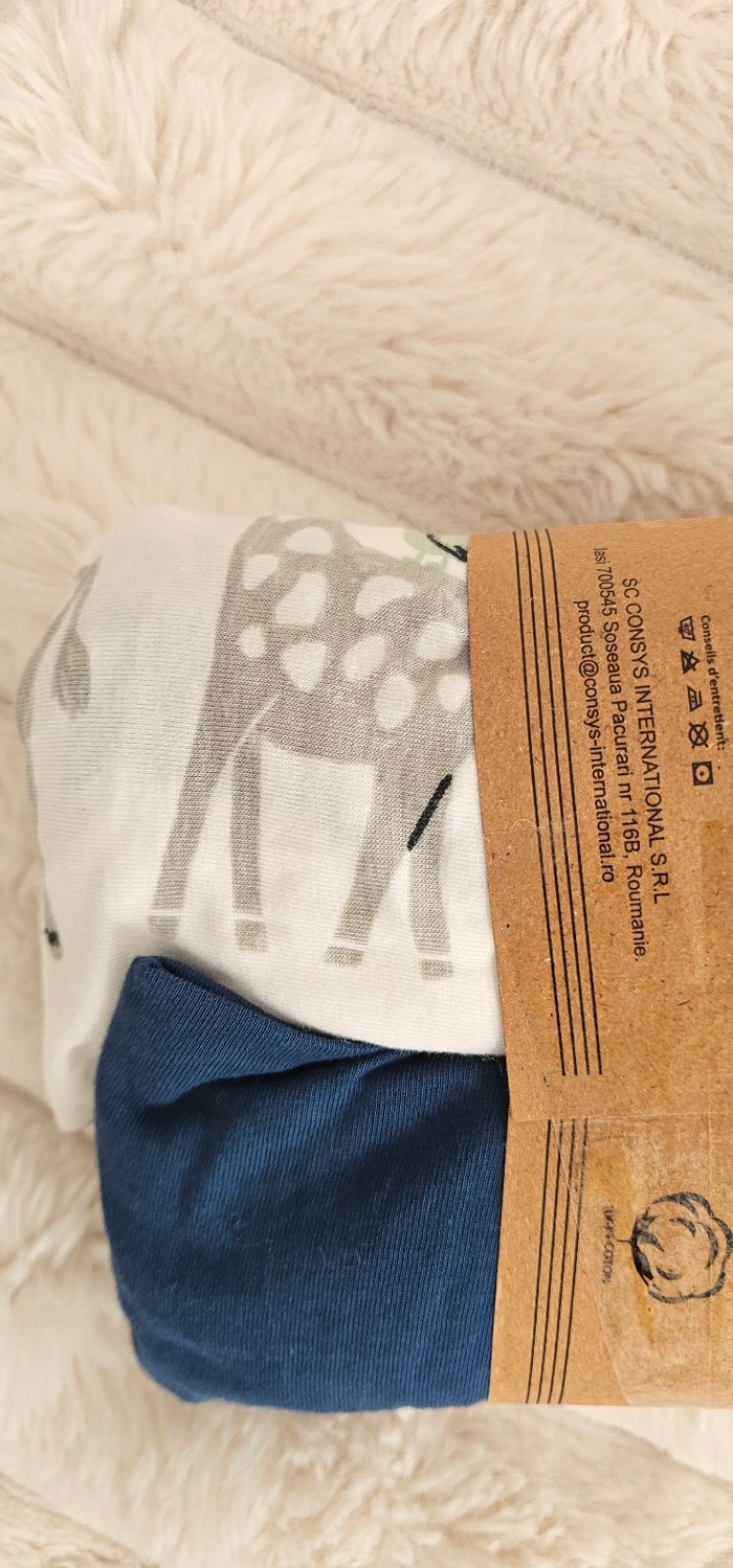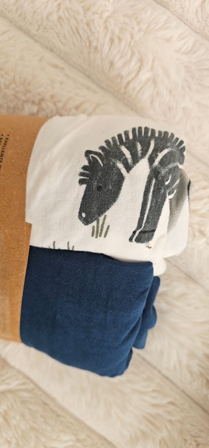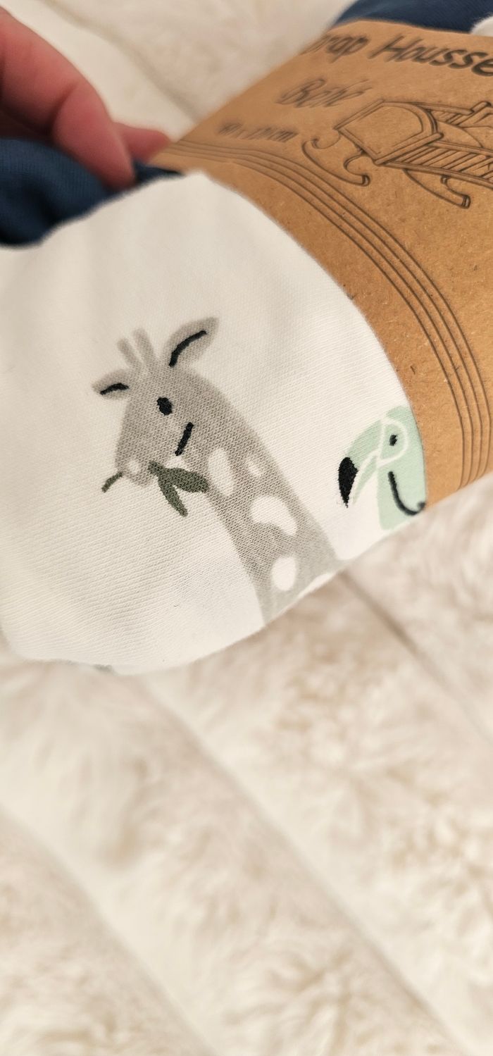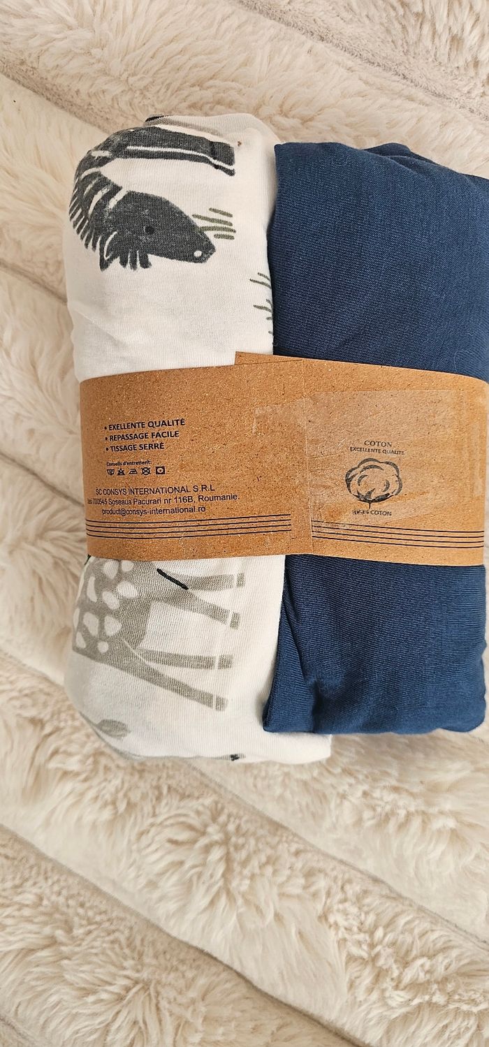 Lot de 2 draps housses 100% coton. Dimension 60×120 cm. Couleur uni bleu marine & blanc avec animaux de la jungle. Tissage serré. Neufs