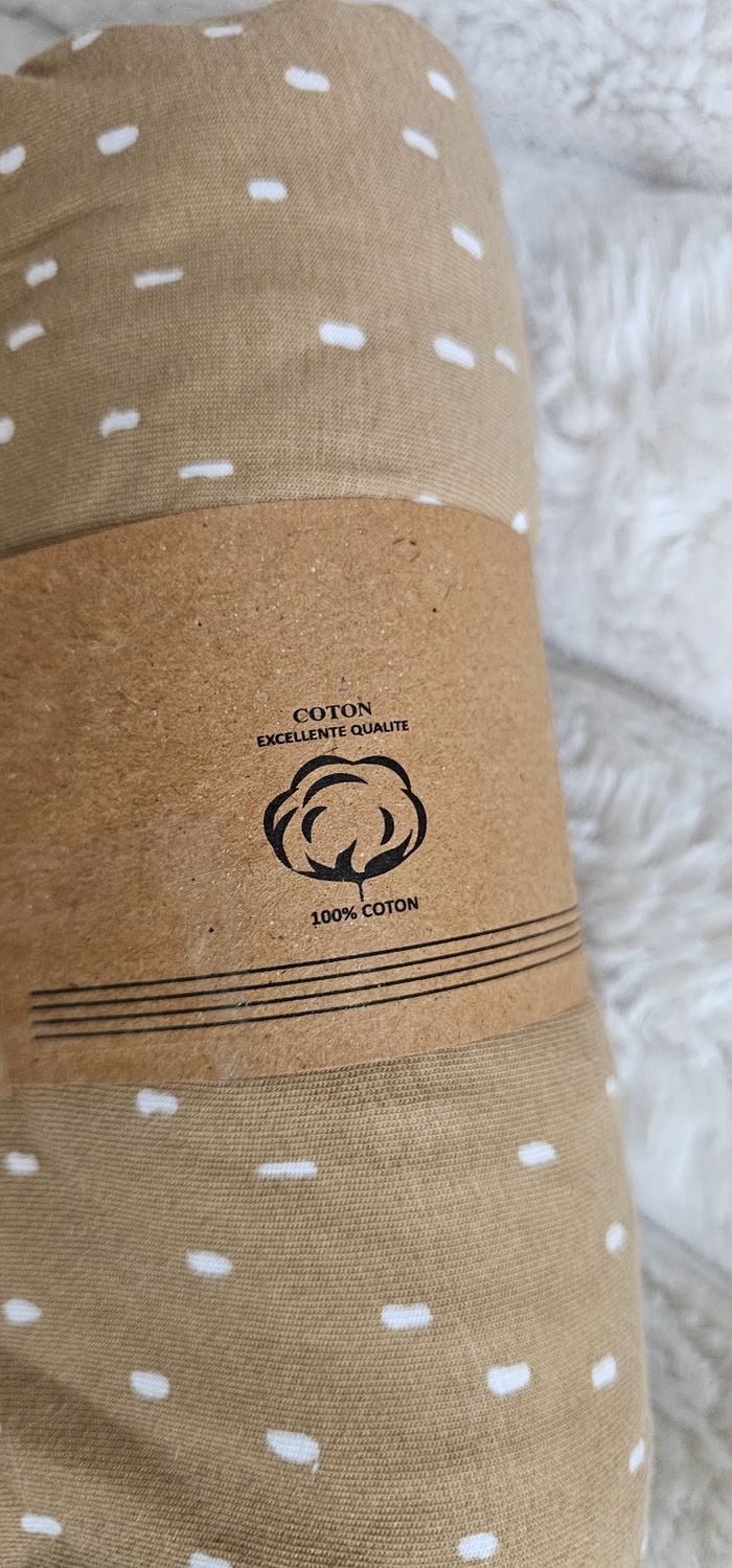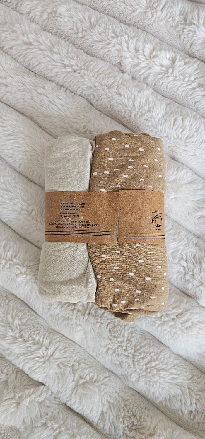 Lot de 2 draps housses 100% coton. Dimension 60×120 cm. Couleur uni beige & marron / ocre a motif. Tissage serré. Neufs.