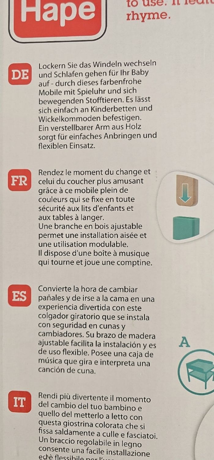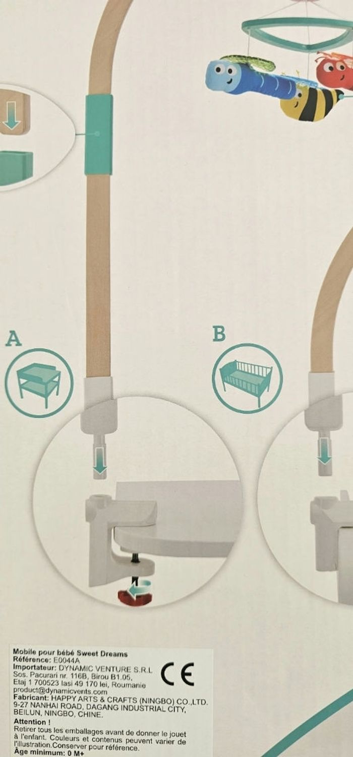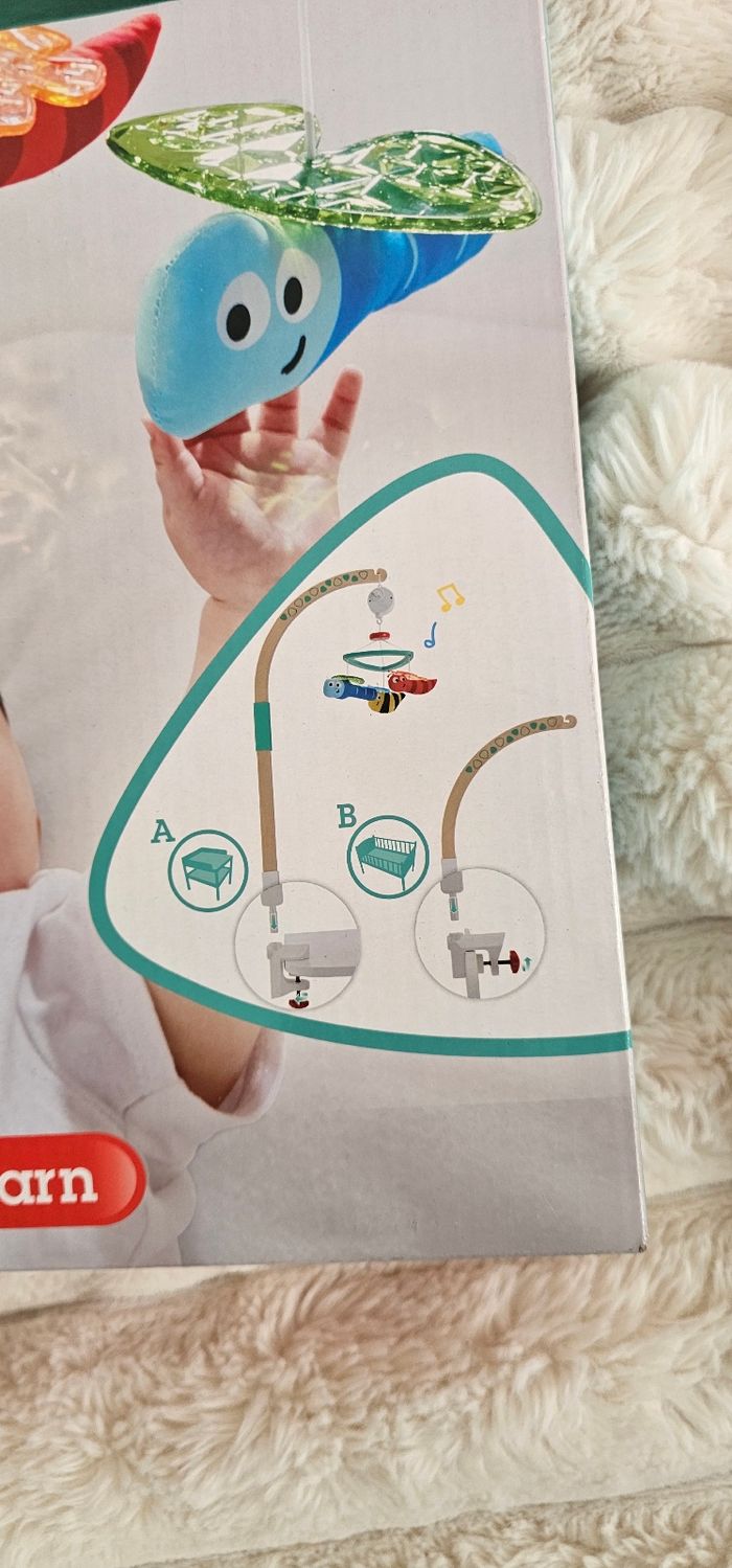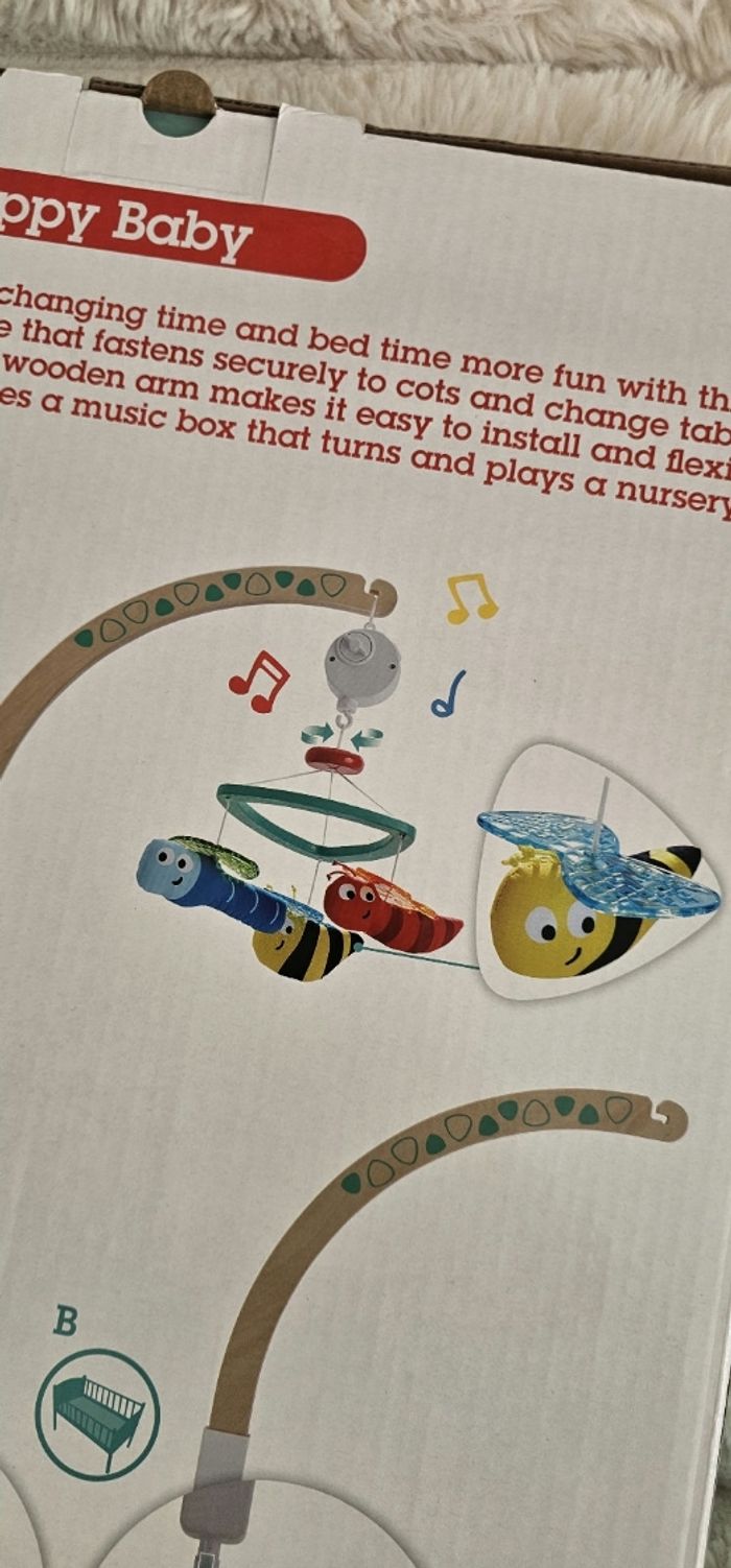Rendez le moment du change et celui du coucher plus amusant grâce à ce mobile plein de couleurs qui se fixe en toute sécurité aux lits d'enfants et aux tables à langer. Une branche en bois ajustable permet une installation aisée et une utilisation modulable. Il dispose d'une boîte à musique qui tourne et joue une comptine. Possibilité de l accrocher a la table a langer ou au lit de bébé. Neuf.