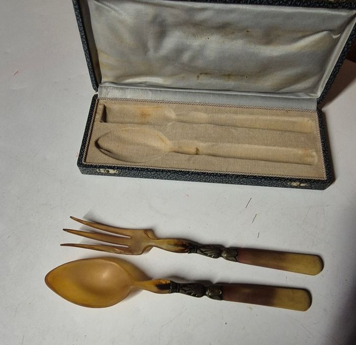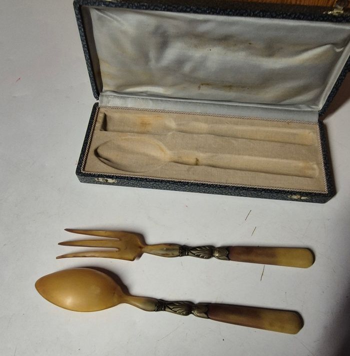 service salade vintage corne métal 25cm coffret ancien art de la table - photo numéro 2